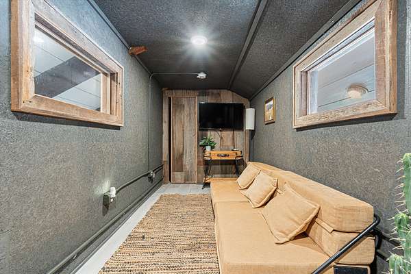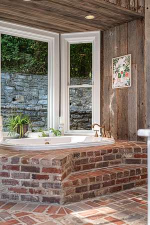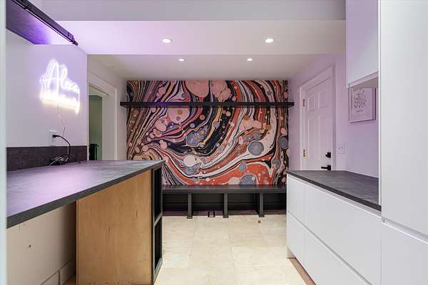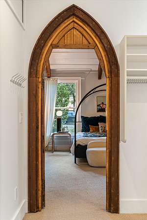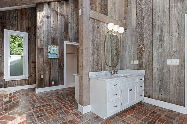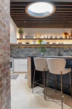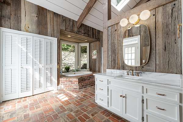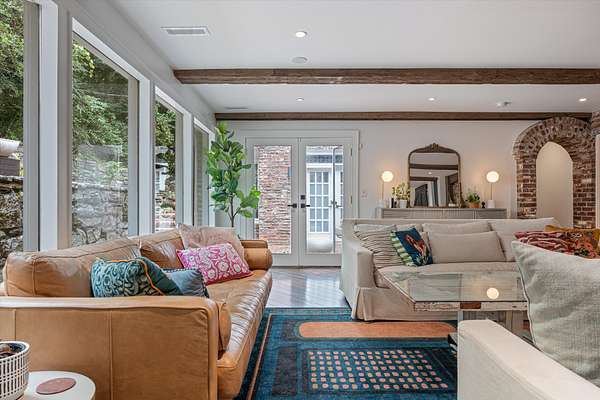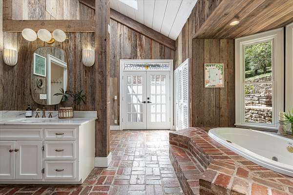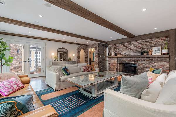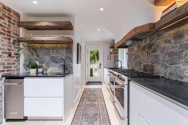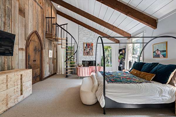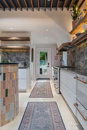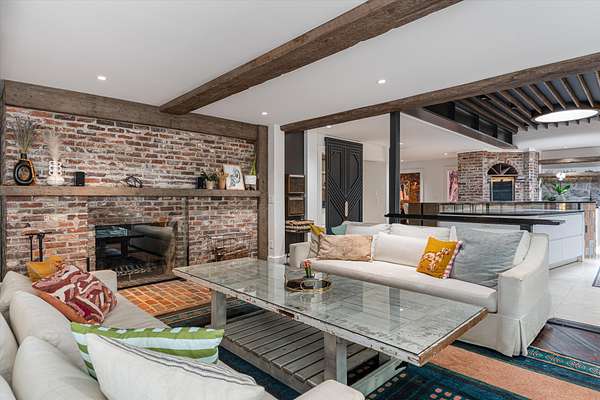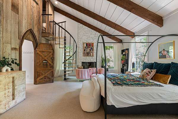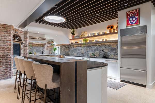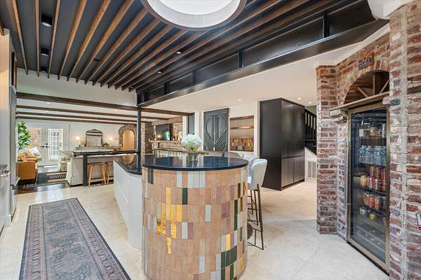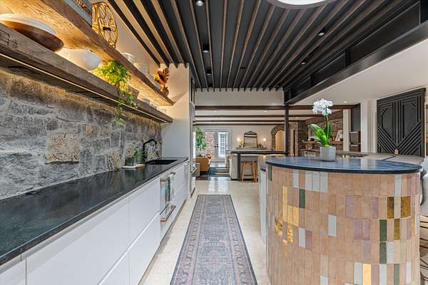 Inside, the 5,002-square-foot layout unfolds with warmth and intention -- layered textures, natural light, and thoughtful scale at every turn. The main-level primary suite rises under cathedral ceilings with exposed beams, a fireplace, and an intimate loft, creating a retreat that feels both grounded and romantic. The kitchen is a showpiece of material contrast -- limestone walls, a curved hand picked/placed zellige-tile island, open shelving, and striking architectural beams -- connecting effortlessly to multiple living and dining spaces defined by tone, texture, and curated personality.
