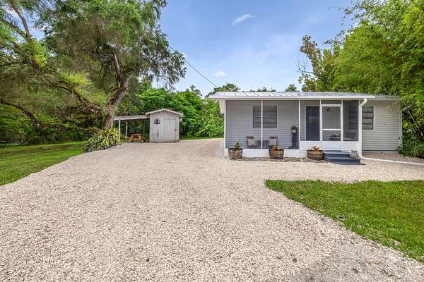 Zoned AG-2, the property supports a wide range of permitted uses, including short-term rentals (no minimum stay), bed & breakfast, agricultural operations, caretaker's residence, administrative office, and more. A meandering creek connects to the Caloosahatchee River, attracting wildlife such as owls, turtles, fish, and the occasional gator. The former owner, a botanist, curated the land with an extraordinary mix of tropical and native plantings -- including starfruit, ginger, crotons, royal palms, and mature oaks that create a serene, park-like setting.