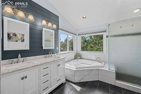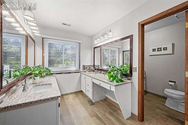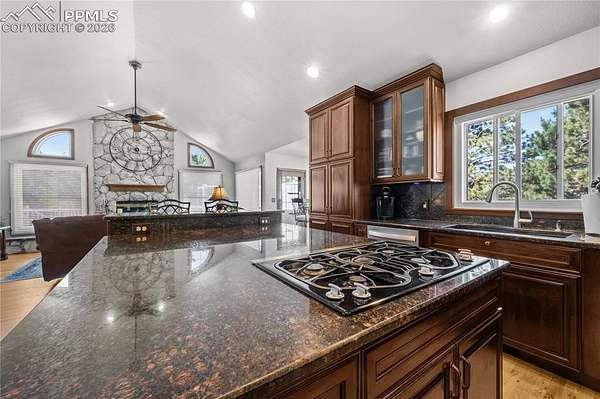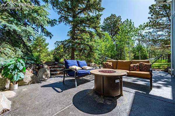 Set on nearly 5 acres of beautifully landscaped and reforested land, this welcoming ranch-style home offers the space, privacy, and lifestyle many Denver buyers are searching for-without giving up convenience. Located in the desirable Canterbury East area of Monument, the property provides a peaceful country setting with quick access to I-25, making commuting to Denver or Colorado Springs easy. A newly resurfaced asphalt driveway and stamped concrete entry lead to a home that has been thoughtfully improved and meticulously maintained. Inside, warm wood floors added in 2025, solid oak doors, updated hardware, and fresh interior paint create a timeless farmhouse feel. The kitchen features custom cabinetry and an efficient layout that opens to the dining and living areas, ideal for gatherings and everyday living. Multiple fireplaces add comfort and character throughout the home. The primary suite and bathrooms offer a refreshed, comfortable retreat with multiple updated bathrooms and quality finishes that complement the home's traditional style. The finished basement provides additional bedrooms and flexible living space perfect for guests, recreation, or working from home. Outdoor living is a standout feature, with a rebuilt front deck, expansive back patio with stamped and glazed concrete, custom water feature with boulder wall, dry creek drainage system, and professionally managed landscaping. A full sport court with new lighting offers space for pickleball, basketball, or year-round recreation-rare to find on acreage this close to town. Major improvements include a Class 4 impact-resistant roof, new gutters, new furnace, hot water heater replacement, and updated windows. This property offers a rare opportunity for Denver-area buyers to enjoy land, privacy, and a true Colorado farmhouse lifestyle within an easy commute.