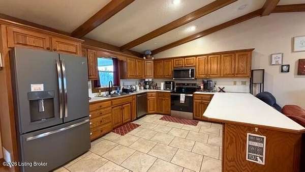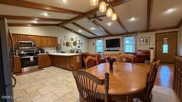 Comfortable four-bedroom two bath brick ranch style home with partially finished walkout basement & lower single car garage situated on 3.89 serene country acres in the small-town community of Bloomfield, Ky. Home offers a desirable open concept floor plan. Living Room with laminate flooring, Tiled eat in Kitchen with stainless appliances. Primary suite with Laminate in the Bedroom & vinyl plank in the Bath. Two additional bedrooms with laminate flooring are housed on the main level. Venture downstairs to the basement to enjoy the carpeted Den area perfect for family movie night or would make an excellent man cave. Additional 4th bedroom, office, bathroom & Laundry complete the basement. Outdoor features include a rear patio & covered deck & barn. Don't miss this great country home.