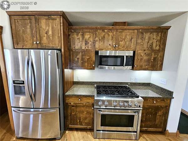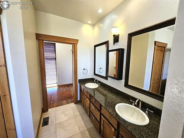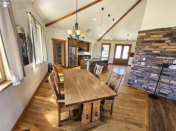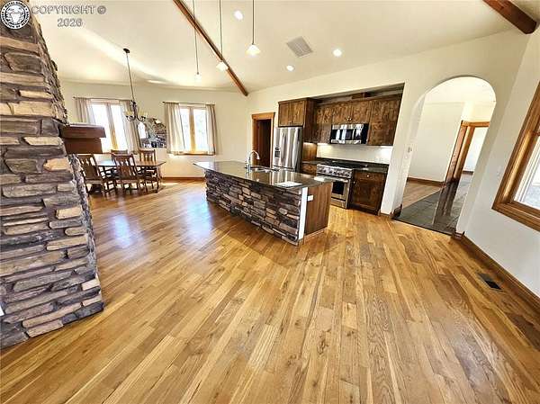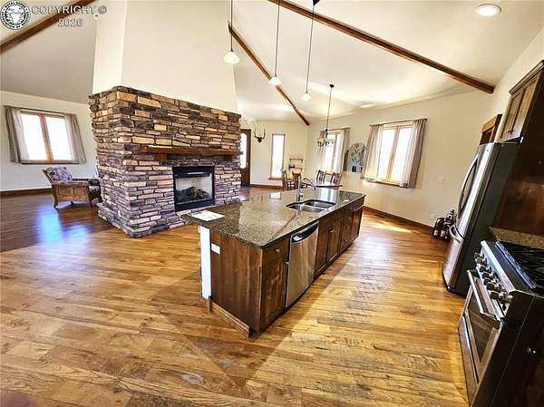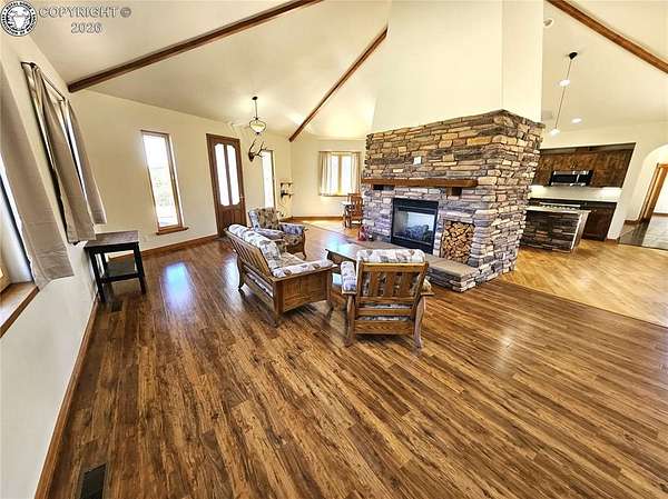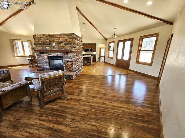 Set against breathtaking mountain views, this stunning 3,079-square-foot mountain home offers the perfect blend of comfort, space, and natural beauty. Nestled on 35 private acres, the property provides unmatched tranquility, wide-open skies, and panoramic vistas that can be enjoyed from nearly every angle. Designed with both luxury and functionality in mind, the home features three spacious bedrooms and three and a half bathrooms, including two master suites. Each master bedroom offers a private retreat with generous space, large windows that frame the surrounding landscape, and en-suite bathrooms designed for relaxation and convenience. Whether accommodating family or hosting guests, the dual master layout ensures privacy and comfort for all. The main living areas are thoughtfully arranged to capture the beauty of the outdoors while maintaining a warm, inviting atmosphere inside. Expansive windows bring in natural light and showcase the sweeping mountain scenery. The open floor plan allows for effortless flow between the kitchen, dining, and living spaces-ideal for entertaining or simply enjoying peaceful evenings at home. Double fireplace in the living area. A well-equipped kitchen provides ample counter space and storage, making it perfect for preparing meals after a day spent exploring the acreage. Outside, the 35 acres offer endless possibilities, from hiking and wildlife watching to creating gardens or simply savoring the quiet serenity of mountain living. Completing the property is a two-car garage with an attached shop area, perfect for storage, hobbies, or projects. Whether you're seeking a full-time residence or a private mountain retreat, this exceptional home delivers space, privacy, and spectacular views in every direction.