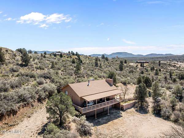 Gorgeous Mountain Views on 3,021 Acres, Ideally situated set back off the road via a winding driveway to a private tucked away location. This 2-level home offers a 1 car garage w/a large storage/workshop area/laundry area. 2 bedrooms down w/ a full bathroom. Upstairs is a nice sized kitchen with eating area. Panoramic views, open to the great room w/brick fireplace. The great room opens to a full covered walkout deck. A few steps up to the loft area/office. Primary bedroom & full bath. This home has lots of possibilities. Bring your horses. Peeples Valley is the Best Kept Secret. Beautiful Skies, Clean Air & Views.