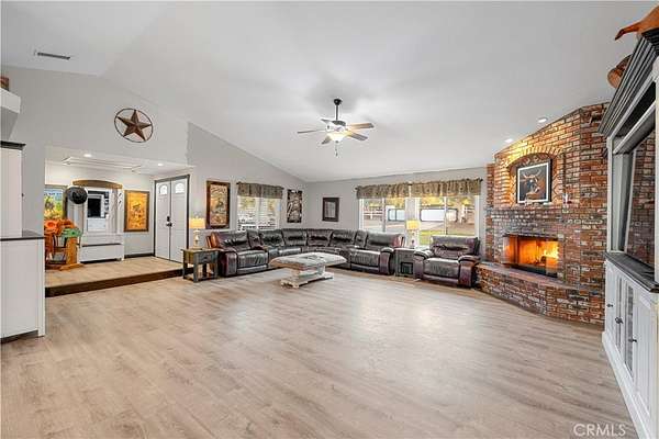 The family room is the heart of the home, complete with a brick mantle fireplace. Recent upgrades include dual-pane UV-reflective windows, new stucco and exterior paint, a new gate, and new garage doors. The garage has been thoughtfully converted into an office/gym with its own AC, providing versatile use for today's lifestyle.