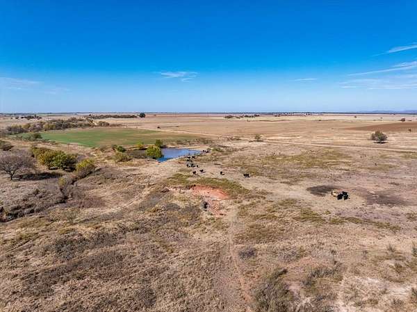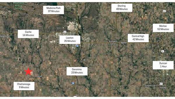 Discover 400 acres (MOL) just beyond the foothills of the Wichita Mountain range, offering a rare opportunity to acquire a sizeable ranch holding in Comanche County. Held by the same family for over 3 decades, this ranch features a balanced mix of grazing land, wheat production, native grass, & established cattle infrastructure suited for real day-to-day operations. As you enter the property, roughly 17 acres form the ranch headquarters, including the original barn, a newer hoop barn, livestock sorting pens, & 5 granary silos. The old homesite remains identifiable, complete with a storm cellar & existing water spigots from a prior well. Electric service has been available here historically; a new owner can have power reconnected as needed. Beyond the barnyard are 3 primary pastures; approximately 175 acres, 80 acres, & 8 acres, used for wheat production, cultivated native grass, & rotational grazing. Each pasture is fenced independently, with hot-wire fencing in place for ease of cattle management. Between these pastures sits approximately 120 acres of native grassland following a winding creek bed that cuts diagonally through the center of the property. This corridor includes pockets of timber, natural shade, & multiple seasonal water sources. A larger pond in the NW section provides an additional reliable water point. The blend of creek bottom, timber, & open ground draws abundant wildlife, making this a strong hunting & recreational tract alongside its agricultural value. Located in the SW wing of Lawton, the ranch offers the privacy of a rural setting with sweeping mountain-view vistas, while still being within reasonable distance to town, approximately 25 mins to the Lawton core, 16 mins S of Hwy 62, & 8 mins from Chattanooga. With natural water features, solid topography, & diverse land makeup, this tract offers a versatile opportunity well-suited for expanding a cattle operation, long-term land investment, or strong recreational or hunting use in SW Oklahoma.