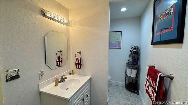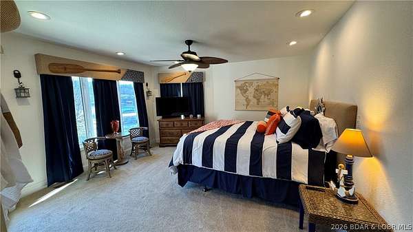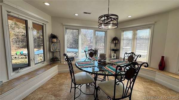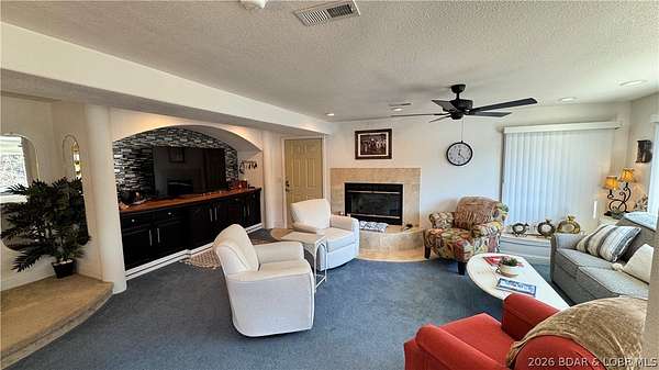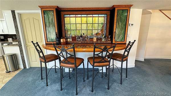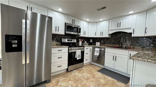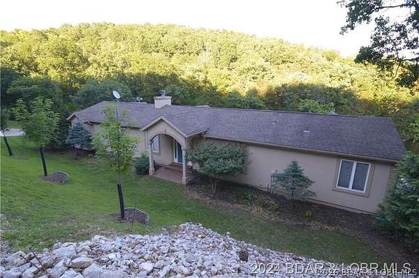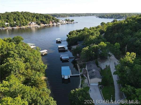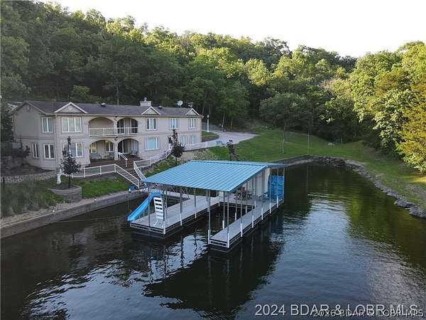 Magnificent 5BR/3BA lakefront estate offering 379' of shoreline and 5 acres of privacy at the 3MM of the Gravois Arm. Tucked into a quiet cove with wraparound frontage, this property feels like your own private oasis with deep water year-round and just a few easy steps to the private dock. The updated kitchen features new cabinetry, granite countertops, stainless steel appliances, and a stylish backsplash. The open concept layout flows seamlessly into the bar area and inviting family room with cozy fireplace and custom built-ins-perfect for gathering and entertaining. All five bedrooms are located upstairs, including three with access to the upper terrace showcasing peaceful lake views. A covered patio provides the ideal setting for outdoor dining and relaxing. Ample parking plus a 2-car attached garage. The garage loft includes rough-in plumbing and electrical-ready for a future bunk house or guest suite. Close to waterfront restaurants, gas docks, and lake attractions. Exceptional location, acreage, and shoreline-lake living at its finest!