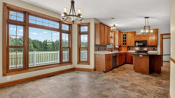This stunning country home offers the perfect blend of privacy and convenience, set on 2.7 acres just minutes from downtown Chippewa. Surrounded by lakes and rivers, the location is truly unbeatable. Inside, you'll find four bedrooms on one level, a spacious main-floor living room, formal dining area, and a generous eat-in kitchen. The four-season room overlooks the private backyard, creating a perfect space to relax year-round. For everyday convenience, there's a half bath and laundry room with utility sink just off the garage. The finished lower level features a walkout rec room with wet bar, an additional bedroom with its own bath. Granite countertops in the kitchen add a touch of elegance. Outside, you'll appreciate the attached insulated and fully finished three-car garage, plus a 30x24 detached garage that could easily be insulated. A circle drive makes entertaining and family gatherings effortless. This is a truly exceptional family home in a location that's hard to beat!