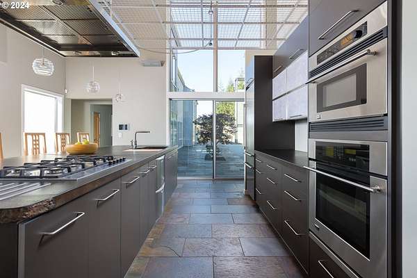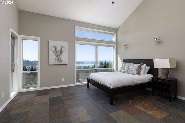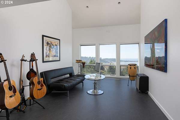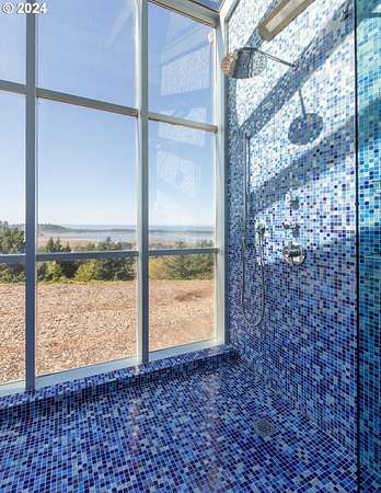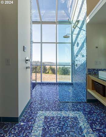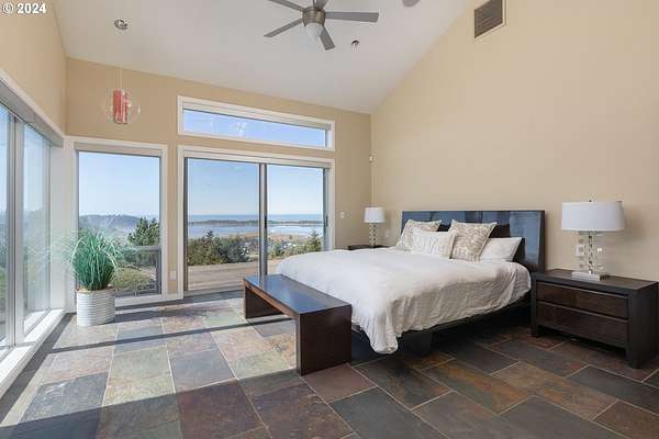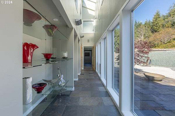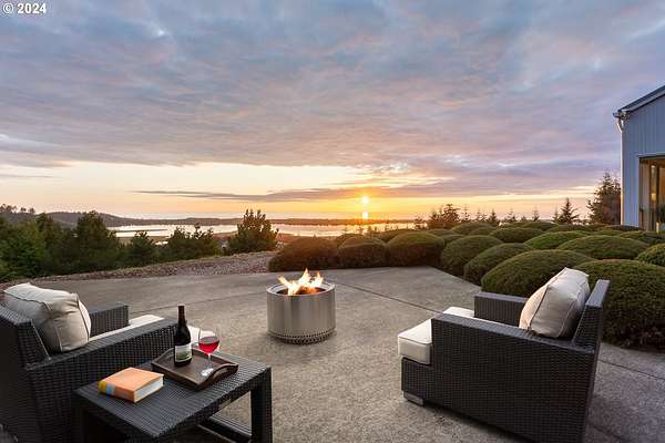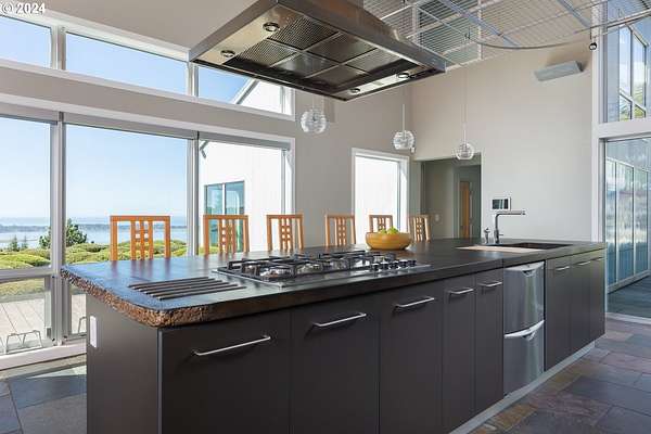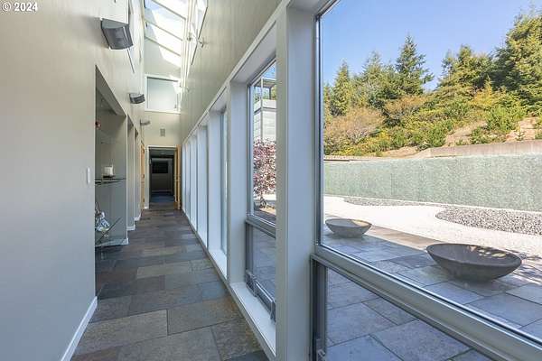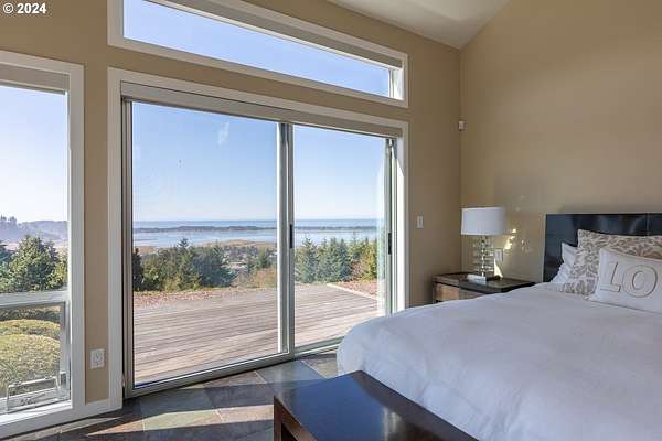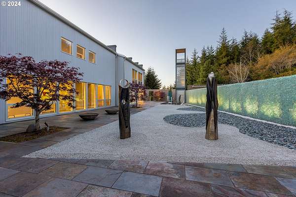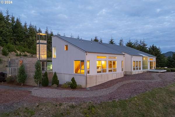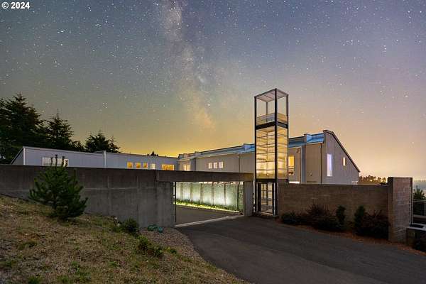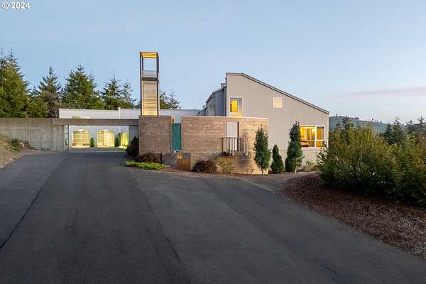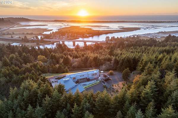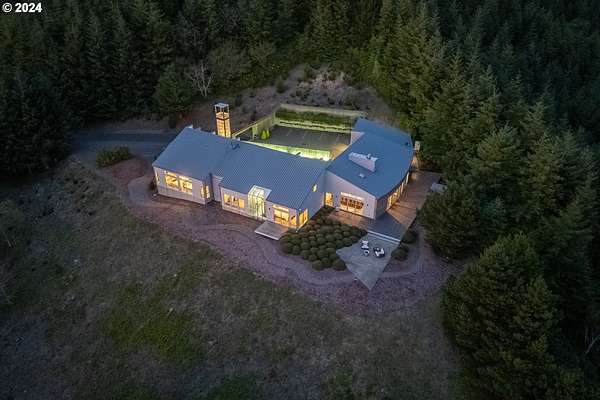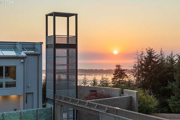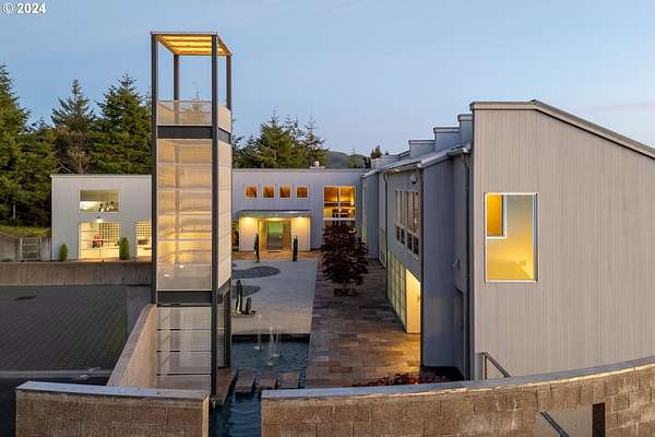 Breathtaking Coastal Estate in Oregon - 179 Siletz Highway. Designed by award-winning architect Robert Hermanson, this extraordinary private estate offers nearly 5,000 square feet of spacious living and luxurious amenities. Perched atop Siletz Bay, it is a true masterpiece of coastal living, perfect as a full-time residence or an exclusive getaway. This stunning property envelops you in a cocoon of tranquility, ideal for accommodating family and guests or hosting lavish gatherings; the possibilities are endless for the life you can create in this remarkable residence. As you approach the estate through its gated entry, the magic unfolds amidst the serene forested hillside, revealing the iconic campanile and elegant courtyard, complemented by ample guest parking and a secure garage. A soothing bubbling fountain pool and Zen Garden, framed by a lighted gabion glass wall, provide a tranquil retreat for the senses, while an elevated viewpoint near the tower offers panoramic vistas of the Siletz River delta, Siletz Bay, and the majestic Pacific Ocean stretching infinitely beyond. The sophisticated exterior, clad in durable cedar and stainless steel, exemplifies the exquisite harmony of design and materials. Step through the grand steel entrance door into the expansive great room, featuring soaring vaulted ceilings and an impressive slate floor. A massive fireplace and a wall of glass create an inviting atmosphere, while custom lighting sets the perfect mood. The gourmet kitchen boasts ocean views, high-end appliances, gull-wing cabinets, and a spacious island, ready for your culinary masterpieces, with a dining bar that seats six and a dedicated dining area for larger gatherings. Don't miss your opportunity to own this one-of-a-kind coastal estatean unparalleled blend of luxury, privacy, and breathtaking natural beauty.