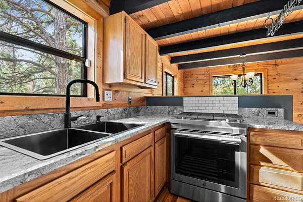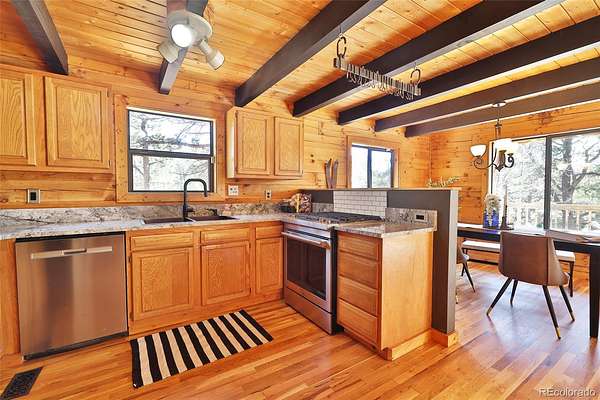 Inside, the open floor plan centers on a wood-burning stove framed by vaulted ceilings and warm natural light — the kind of space that photographs well and lives even better. The fully updated kitchen features new appliances and granite countertops, and every room has been refreshed with new paint and remodeled finishes (2020). Two full bathrooms and three comfortable bedrooms make this an easy, turnkey stay for guests or a full-time escape from the Front Range.