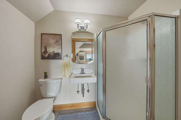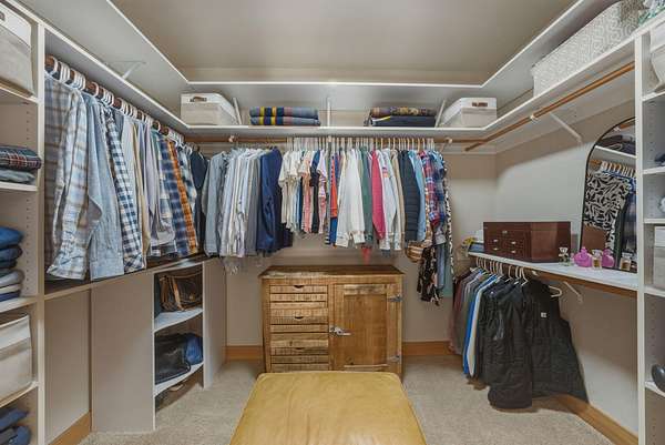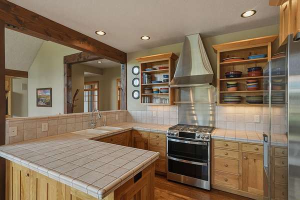 - Breakfast Bar, Built-In Features, Central Vacuum, Double Vanity, Enclosed Toilet(s), Fiberglass Stall Shower, Linen Closet, Open Floorplan, Pantry, Primary Downstairs, Shower/Tub Combo, Soaking Tub, Tile Counters, Vaulted Ceiling(s), Walk-In Closet(s), Wired For Data, Wired For Sound