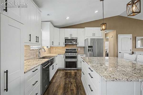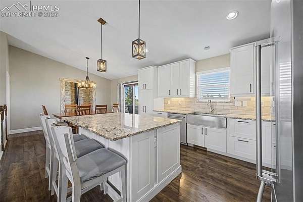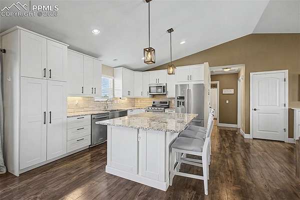 There's a moment when you pull into the driveway and everything just... quiets down. The noise, the neighbors, the hustle is gone. In its place? Five private acres, wide-open skies, and the kind of blue sky views that remind you why you wanted more space. This updated ranch-style home was designed for living well. Inside, vaulted ceilings and natural light create a warm, inviting great room anchored by a cast iron wood-burning stove-perfect for cozy evenings. The updated kitchen is the heart of the home, built for everyday living and effortless entertaining, featuring granite countertops, a large island, farmhouse sink, and new stainless steel appliances, including a double oven. Step outside onto the 28' x 12' composite deck and take in the fresh air while you enjoy a BBQ with your family. The main-level primary suite offers a peaceful retreat with a walk-in closet and beautifully updated bath with double vanity, granite counters, walk-in shower, and custom tile. Two additional bedrooms and a full bath complete the main level. Downstairs, the finished walk-out basement adds flexibility with two additional bedrooms (one non-conforming), a 3/4 bath, spacious laundry room, and ample storage. And then there's the shop - a newer 1,200 sq ft shop (30' x 40') with 14' ceilings, two oversized doors, abundant electrical, and a 50-amp RV hookup ready for your projects and all your recreational toys. The 20' x 165' driveway is perfect for anyone with an RV or large deliveries. The fenced acreage is zoned for residential agriculture and built for living outside complete with a chicken coop, space to roam, and a 200-yard hill perfect for sledding or riding. This is the kind of property where weekends don't require a plan because you just step outside. With fiber internet (1000 mbps), new well capacity tank and a recently cleaned & certified septic system, the heavy lifting is already done. Been looking for space and, privacy, this is is!