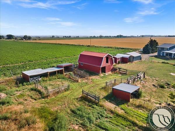 Grab the opportunity of your own lifestyle block! Animal enthusiasts dream property! Ride your horses on 9.39 acres of irrigated grassland or just enjoy a little space away from your neighbors. Surrounding farmland percolates the peace and tranquility hobby farms provide. Outbuildings include: 2 car garage, 3 sheds, tractor carport, horse barn and small animal outbuilding with pen. Property is cross fenced, flood irrigated, contains a space for a riding arena and previous garden area. The house has updated siding, roof, furnace, A/C and encompasses newly remodeled kitchen with hickory cabinetry, gas range, double ovens and new counter tops. Location is approximately a 25 minute interstate drive to the west end. Impossible to find property with acreage, (close into town) that includes well(s) and irrigation shares. Call your agent today for viewing.
