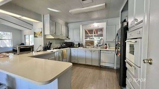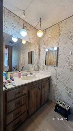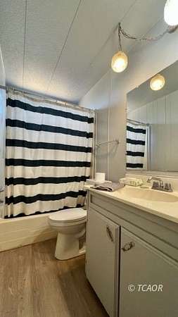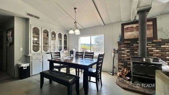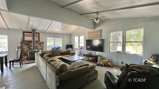 - Laminate/Formica Linoleum/Vinyl, Countertops Wood, Vaulted Ceilings, Ceiling Fan(s), Wood Stove, Flooring Flooring