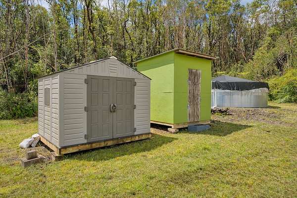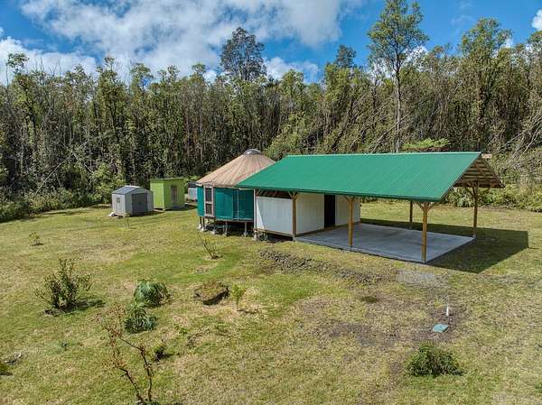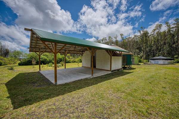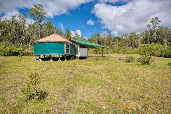 Tucked away from residential areas and nestled near local farms, this 6.56-acre off-grid oasis in Mountain View, Big Island, offers unmatched privacy and endless possibilities for your dream retreat, homestead, or private escape. Featuring a professionally installed yurt (just over 2 years old) with high ceilings and a skylight, this property is a blank canvas ready for your vision. The expansive, covered lanai is perfect for an outdoor living space, or gathering area, all while surrounded by the serenity of nature and breathtaking starry skies. This secluded sanctuary provides rare gigabit internet and Wi-Fi 6E via an underground fiber-optic connection, making it ideal for remote workers or digital nomads seeking paradise. It's equipped for sustainable living with 3 lithium batteries for solar power, a new 10,000-gallon water catchment system, an 85-gallon tank, and a UV filtration pump for self-sufficient living. The land is fertile with existing hibiscus, lemon, cherry trees, pineapples, and Hawaiian raspberries, and the elevation is perfect for growing strawberries, blueberries, and more. Pre-installed plumbing and electrical tubing are ready for a potential bathroom and laundry room, with the green friendly option of a compost bathroom system. Enjoy the privacy of 6+ acres, just a short drive off Steinback Highway, with Keaau 15 minutes away and Hilo Airport approximately 30 minutes away. Surrounded by farms, the fertile land and elevation make this perfect for year-round farming and sustainable living. The current owners have lovingly prepared this property but must part with it-your gain! With the yurt's beautiful stained and fire-sealed wood flooring, a sturdy foundation, and modern infrastructure in place, you can bring your vision to life. The seclusion, privacy, and proximity to farms make this a rare opportunity to create your ideal off-grid lifestyle on the Big Island. The yurt is in great condition, offering an open and inviting atmosphere.