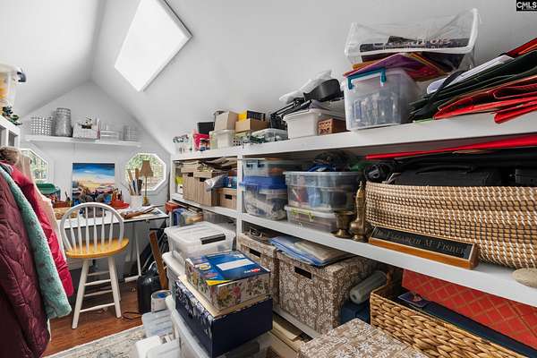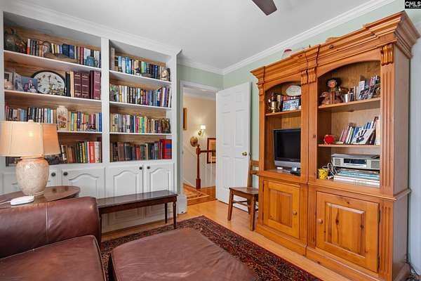 - Attic Pull-Down Access, Attic Storage, Book Case, Ceiling Fan, Security System-Owned, Smoke Detector