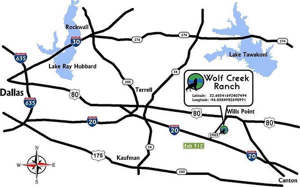 Head East from Dallas on I-20. Pass the Buccess on your right. Exit FM 2965, head North back over the interstate. Wolf Creek Ranch will be 2.5 miles up on your right.