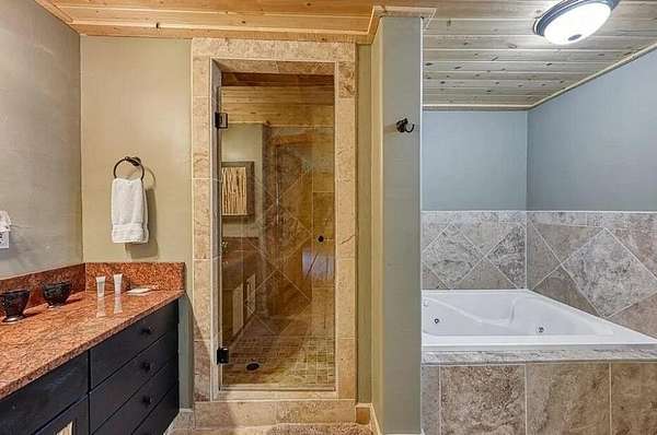 - Beamed Ceilings, Bookcases, Breakfast Bar, Cedar Closets, Ceiling Fans, Dressing Area, Dual Sinks, Great Room, High Ceilings, High Speed Internet, Home Office, Jetted Tub, Kitchen Island, Living Dining Room, Main Level Primary, Multiple Living Areas, Multiple Primary Suites, Pantry, Separate Formal Dining Room, Sitting Area In Master, Skylights