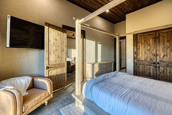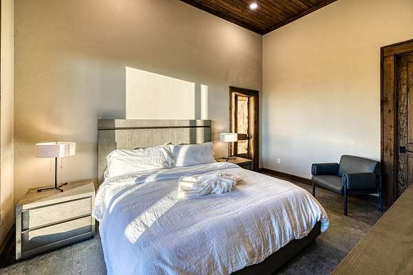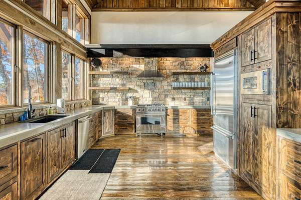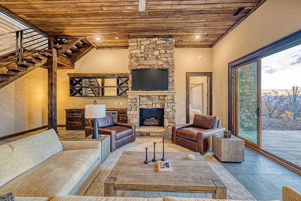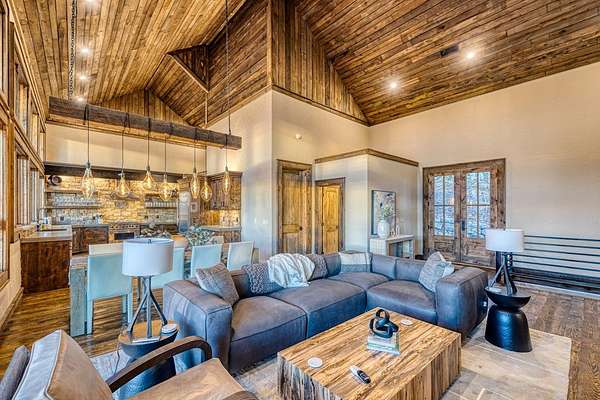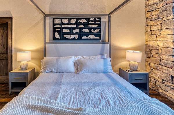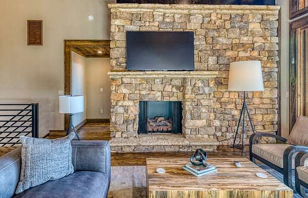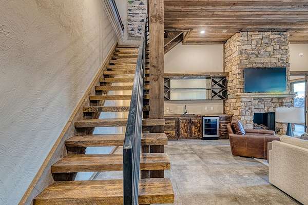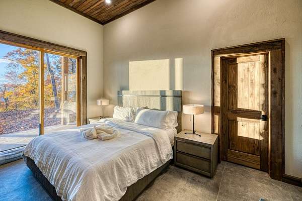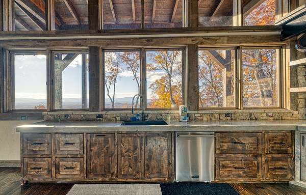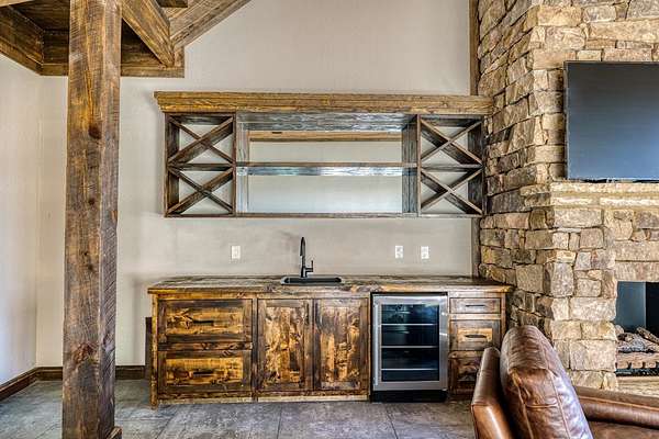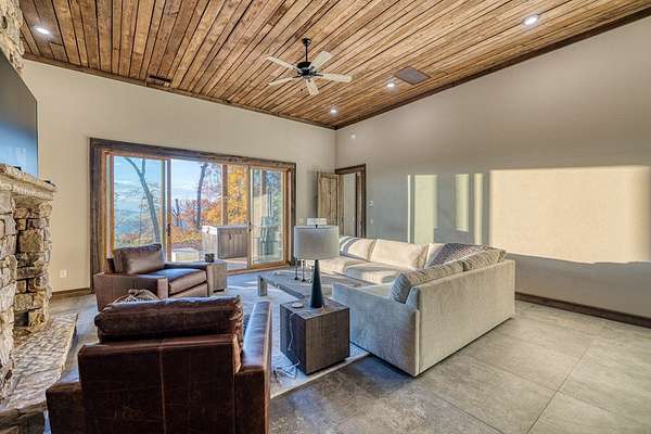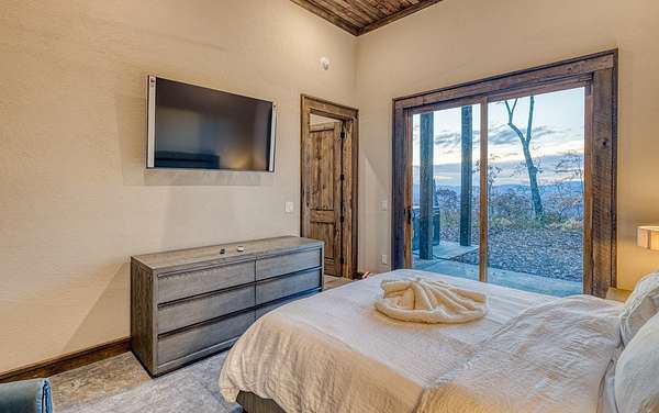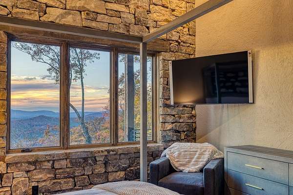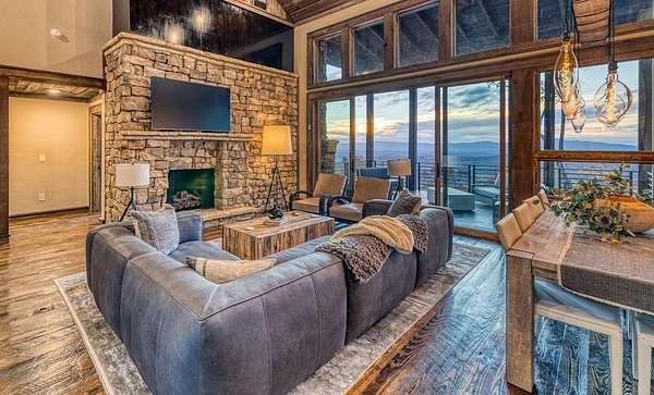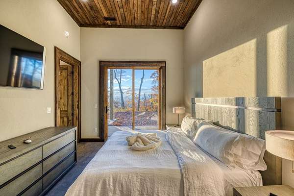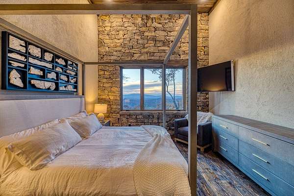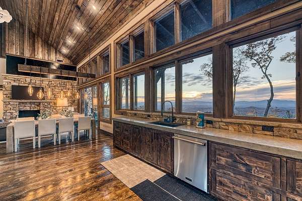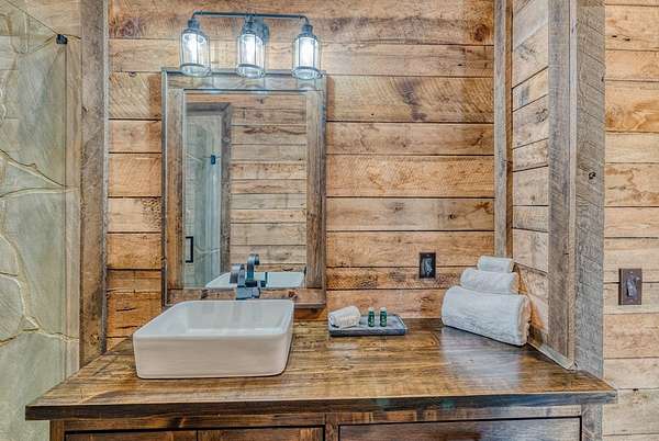 Custom designed and built by Keith Sumner Custom Homes, this new cabin offers all the bells and whistles! With high-end rustic chic style furnishings and designer lighting through-out.. simply high expectations is all you'll have here! As you step into this grand rustic yet elegant lodge you'll find all the luxuries of fine living as you & your friends spread out in the open and spacious family room. Kickback and enjoy the stone fireplace with a flat screen TV conveniently hanging above for your entertainment. Free wifi and TVs in all common areas have sound bars for streaming music or other audio from a wifi device. If you like cooking you'll be in heaven with the fully equipped kitchen for anything you'll need. Custom rock countertops, stainless steel appliances & an abundance of cooking utensils. Dining table seating for 6. Greystone Ridge offers 2 levels of living area, which makes privacy all yours! Located on the main floor is the master bedroom furnished with an large flat screen TV, King size bed, walk in closet, 2 vanities in the bathroom with a massive rock shower! Also on the main floor is a 2nd bedroom with a queen bed, large flat screen TV, full bath with rock shower, large walk-in closet with washer/dryer for your convenience. Downstairs features 1 bedroom with a cozy king size bed- large walk in closet and a 2nd bedroom with a set of bunk beds and a large flat screen TV. Step out of either room into the entertainment/game room. Making memories is what it's all about! Beautiful table seating for 6 situated in front of the custom designed wet bar, couch for seating around another beautiful stone gas log fireplace w/a TV for entertainment! Being indoors not really your thing? No problem! Get outside and hang out on the large party deck located off the main level! Comfortable sitting for everyone to enjoy the wood burning fireplace & massive TV for all the sports fans! Located on the lower level, outside of the entertainment room has an outdoor kitchen fe