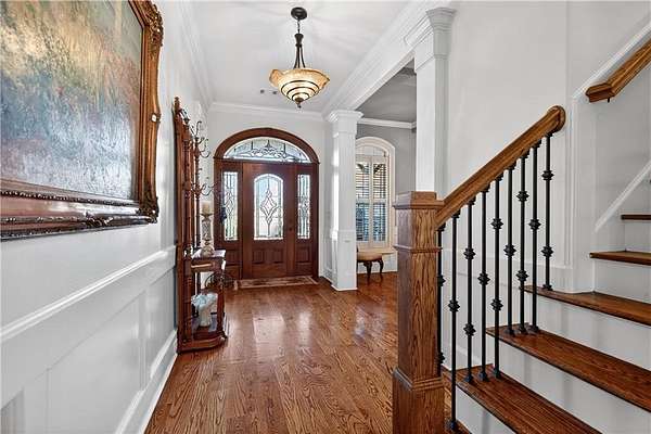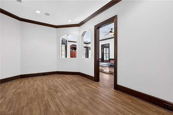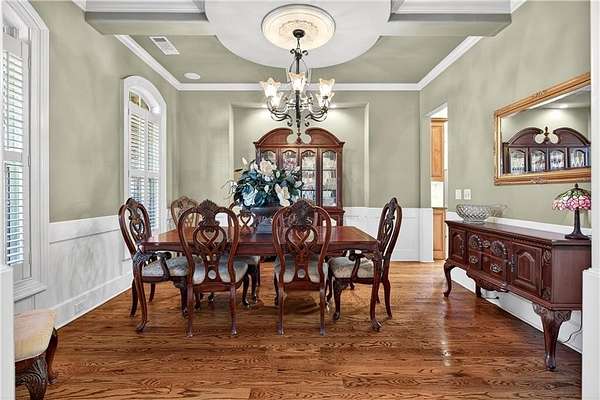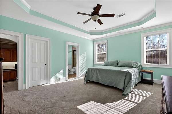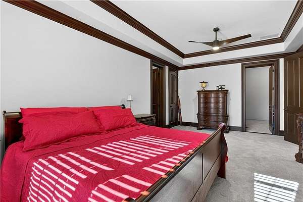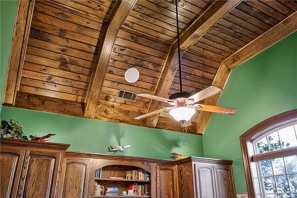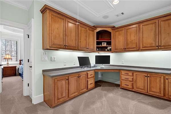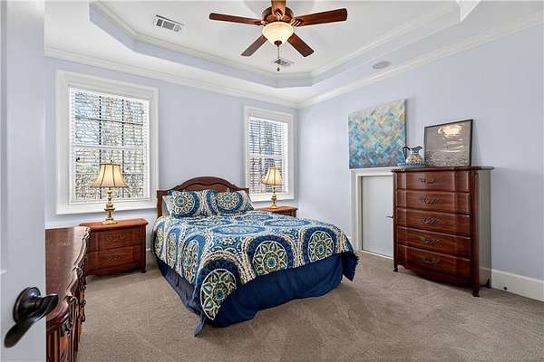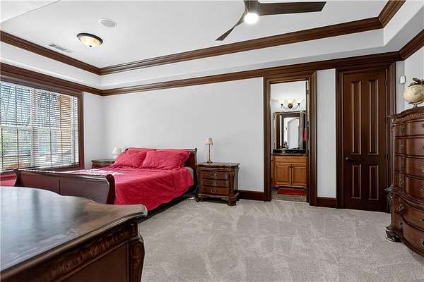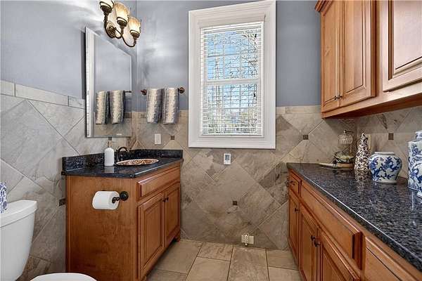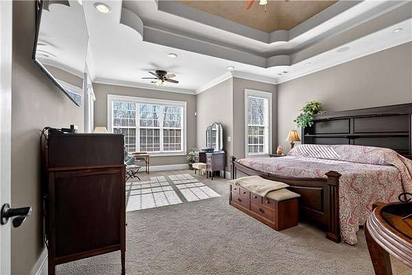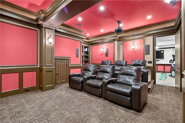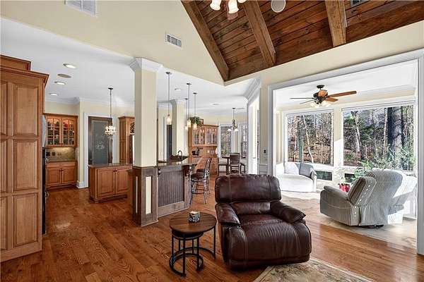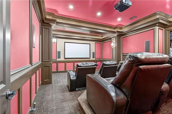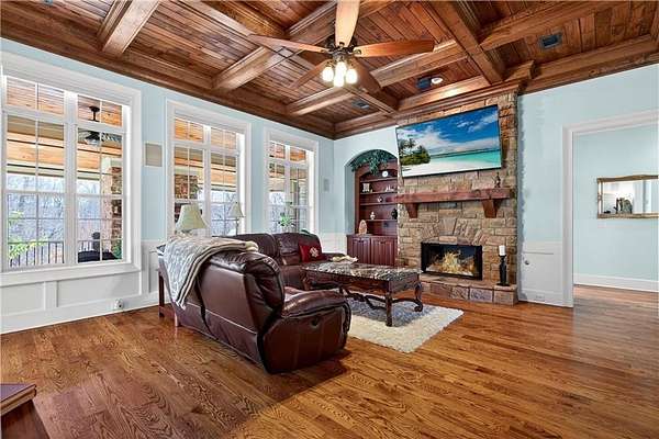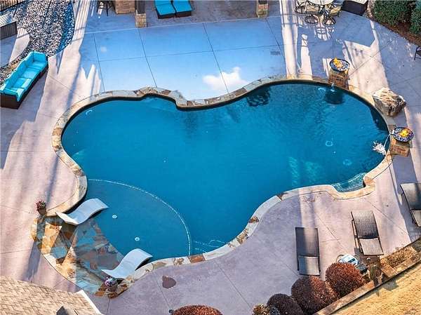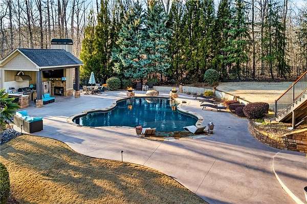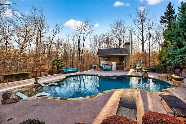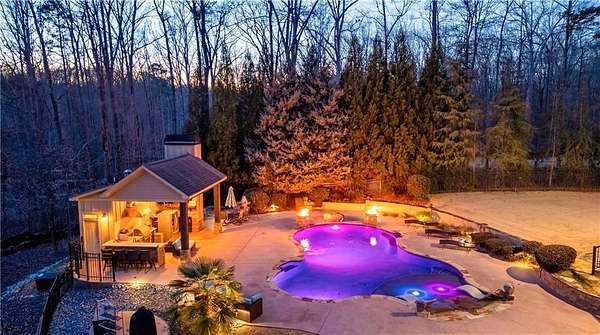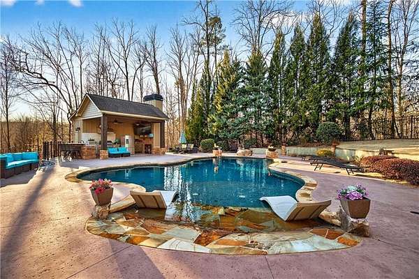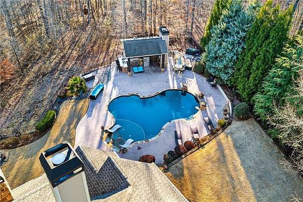 Situated on a private, wooded 1.6-acre lot, this thoughtfully updated home offers 5 bedrooms, 5 full bathrooms, and 2 half baths, with well-defined living spaces across three finished levels. The layout provides flexibility for everyday living, entertaining, and guest accommodations. The main level features a welcoming foyer with access to a formal dining room and a private study located just off the entry. The kitchen is centrally positioned and opens to the breakfast nook, sunroom, family room, and living room, creating a functional and connected flow. The kitchen offers ample cabinetry, pantry storage, and upgraded appliances, including double ovens and gas cooktop, making it well suited for daily use and entertaining. Adjacent living areas are anchored by fireplaces with remote starts, and the sunroom provides additional living space with heated tile flooring. The primary suite is located on the main level and includes a remodeled bathroom completed in 2025 with heated flooring and generous closet space. A laundry room with sink, additional cabinetry and countertop space as well as a main-level half bath complete this floor. Access to the rear deck is also located on the main level and features a wood-burning fireplace, providing an outdoor living area overlooking the backyard and pool. The upper level includes three secondary bedrooms, 2 full bathrooms with great closet storage as well as a loft area with a built-in workspace. The finished terrace level provides additional living and recreational space, including a large entertainment room, bar area, home theater with 110" projection screen and seating, gym area, and an additional bedroom with a full bathroom. Multiple storage areas and exterior access enhance functionality on this level. Outdoor features include a 25,000-gallon Pebble-Tec pool with beach entry, tanning ledge and fire and waterfall features. The pool is heated, and the backyard is fully fenced. The outdoor space also includes a firepit, creating an additional gathering area separate from the pool. A pool house/cabana offers a built-in gas grill, sink, instant hot water, fireplace, high-speed internet, and a dedicated half bath with a washer and dryer, providing a separate space for outdoor entertaining. Additional exterior features include an outdoor hot-water shower, landscape lighting, and an irrigation system. Additional property features include a four-bay garage, whole-home backup generator, multi-zone climate control, whole-house Wi-Fi coverage, instant hot water systems, and updates including roof, interior paint, and exterior paint. This property offers a combination of interior space, outdoor amenities, and privacy in a convenient Newnan location.