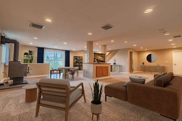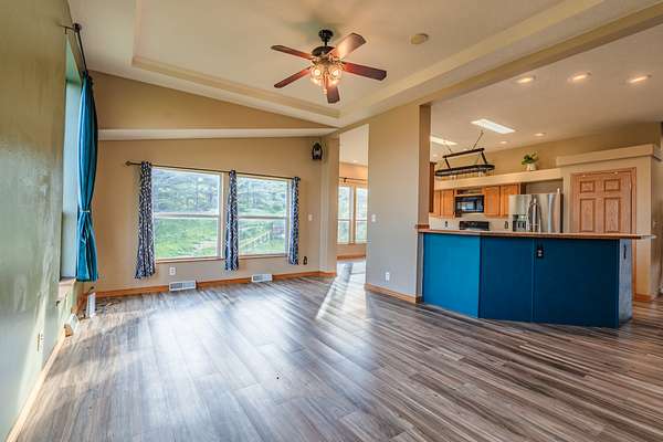 Perched on the northern portion of the property, this two-story, wood-sided five-bedroom modular home offers sweeping views in every direction. The main level features oversized south-facing windows that fill the kitchen, living, and dining areas with natural light, along with three comfortable bedrooms. The lower level includes a spacious walk-out family room, two additional bedrooms, and a private study--perfect for working from home or quiet retreat. Each level is equipped with a wood-burning stove, complementing the gas forced-air furnace for efficient year-round comfort. Note, there are no covenants. Photos of select rooms are virtually staged.