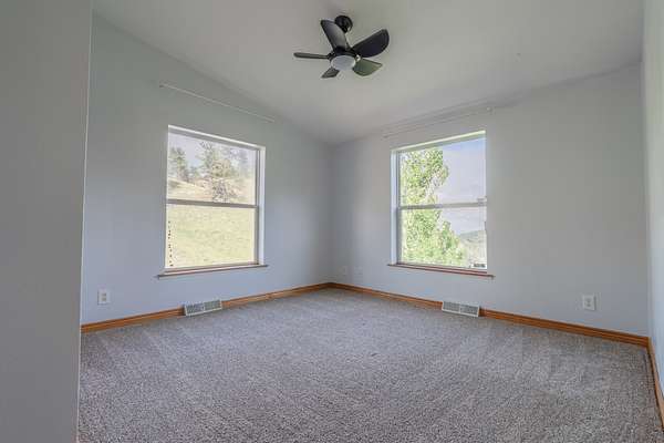From Elkhorn Creek below, the road climbs nearly 300 feet to an elevation of 7,520 feet, offering panoramic views of the surrounding valley. Pine trees scatter the mountainside, while a fenced pasture below the home provides natural grazing for horses. Dramatic rock outcroppings frame the valley, creating shelter and scenic perches for local wildlife. Elkhorn Creek flows through the southern edge of the property, serving as a natural draw for both big and small game. There are two parcels (35 acres and 1.15 acres)