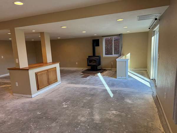 Perched on the northern portion of the property, this two-story, wood-sided five-bedroom modular home offers sweeping views in every direction. The main level features oversized south-facing windows that fill the kitchen, living, and dining areas with natural light, along with three comfortable bedrooms. The lower level includes a spacious walk-out family room, two additional bedrooms, and a private study--perfect for working from home or quiet retreat. Each level is equipped with a wood-burning stove, complementing the gas forced-air furnace for efficient year-round comfort. Note, there are no covenants. Photos of select rooms are virtually staged. Note: All flooring has been removed from the basement and seller will provide credit for new flooring. See before and after photos.