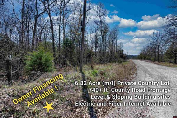Est $225/moOWNER FINANCING AVAILABLE on this private 6.82-acre (m/l) wooded country lot with both level and sloping building sites. Features include over 740 ft. of road frontage, wet weather creek, abundant wildlife, and the potential for beautiful country views with clearing. Electric and fiber internet are available. Build your dream home, vacation retreat, or private getaway with plenty of privacy yet close to shopping, restaurants, businesses, and medical services. Just minutes to Bull Shoals Lake and the White River. Located in Mountain Home School District. (Views subject to building location and clearing plans.)
