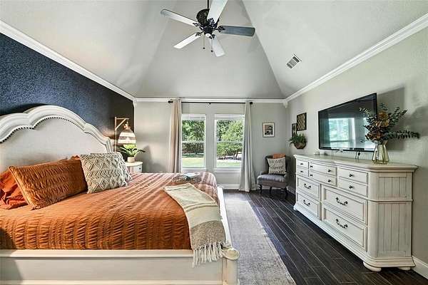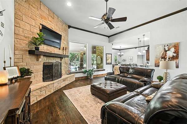 Experience luxury country living with this beautifully designed 4 bedroom, 4 bathroom custom home, perfectly set on 5 fully fenced acres with mature trees and complete privacy and no neighbors behind! A brand new roof, gutters, and screens were installed in August 2025, ensuring peace of mind and long-term value. Inside, the home features elegant hand scraped hardwood floors, granite countertops, crown molding, and spacious bedrooms, three with walk in closets and built in dressers. The chef's kitchen boasts double ovens, a gas range, center island, and bar seating, flowing seamlessly into open living areas ideal for entertaining. Enjoy a private home office, media room, and upstairs game room, along with a large laundry room that includes three built-in pet kennels.