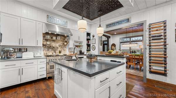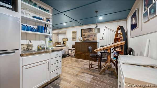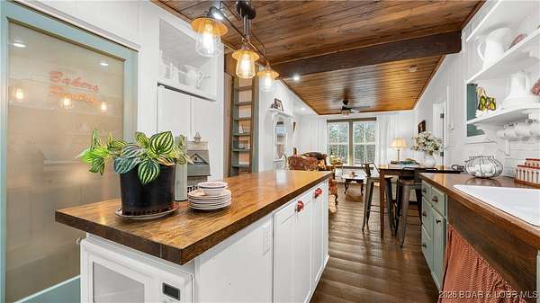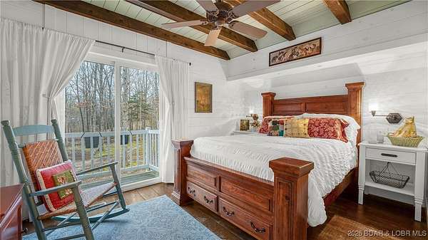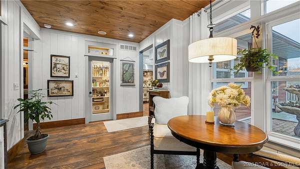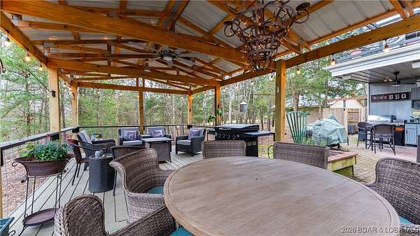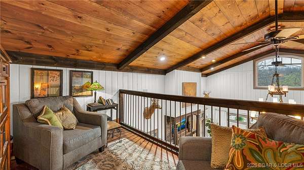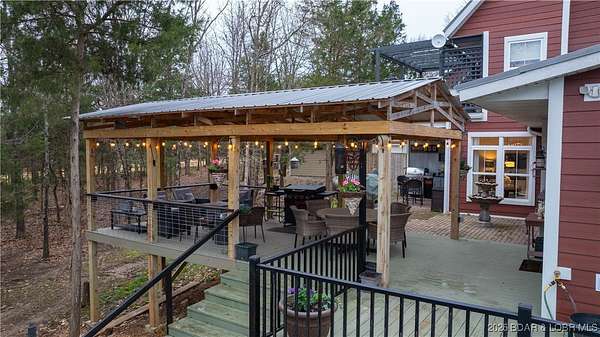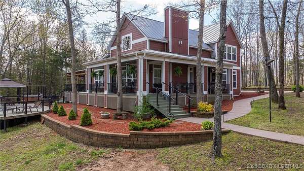 A private lake retreat nestled on 6 acres of gentle ground! This unique home offers privacy from lake chaos, yet sits just 10 minutes from Camdenton for quick access to everything. The home offers many desirable features that you rarely see in today's modern construction - 3/4 inch pine wood floors, pine wrapped walls, covered pavilion w/ outdoor kitchen, gated entry onto the property, 42k btu gas fireplace, wrap around porch w/ aluminum railing, pool, & hot tub. The home sits at 3,646 SqFt, offers 4 bedrooms/4.5 bathrooms, each bedroom is an ensuite - one of which is a standalone apartment, & has main level living. The primary suite is a dream w/ heated floors & towel bar, cedar wood tub, Kohler sinks, walk-in tiled shower, & a barn door entrance. The kitchen offers a duel range(gas top & electric oven), commercial sized refrigerator, 2 sinks w/ 2 inch pipes, walk in pantry & formal dining & sitting rooms. The down stairs presents a second entertainment area with a full bathroom, while the upstairs is where the final 3 ensuites are. Please note, 12 more acres is available to purchase(see attachments). Come check it out!