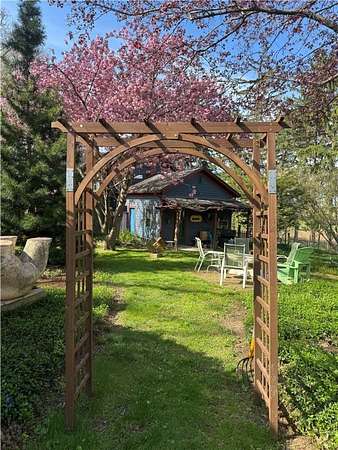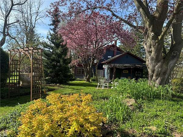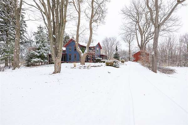 Extremely rare opportunity awaits! SELECT HOME WARRANTY OFFERED! Built in 1812, this remarkable property blends historic character with thoughtful modern updates. Set on 5.88 picturesque acres and extending all the way to the Erie Canal, the land features private wooded trails leading to the waterfront- an ideal setting for peaceful nature walks, kayaking, or simply taking in the beauty of the seasons. The home has been tastefully updated while preserving its original spirit. The home offers 4-5 bedrooms and an abundance of natural light throughout. The kitchen was fully renovated with cherry countertops, new flooring, and custom island. A warm and inviting kitchen addition with a gas stove provides the perfect setting for gathering and entertaining. Additional improvements include a first-floor bathroom, improved flow to the stairwell, and a dedicated library room with built-in bookshelves. One of the most celebrated spaces in the home is the screened-in porch, offering serene views of the lush landscape and a tranquil connection to the outdoors. It is ideal for dining, relaxing, and enjoying the sounds of quiet country living. The acreage is rich with mature plantings and stately trees, including centuries-old sugar maples, walnuts, catalpa, osage orange, Japanese katsura, & more! A historic cherry orchard anchors the back of the property. Throughout the grounds are thoughtfully designed garden beds, creating a vibrant, colorful outdoor landscape. For creatives, hobbyists, and entrepreneurs, the property offers exceptional studio and workshop opportunities. A repurposed garage and a renovated barn space have served as fully functional studios, complete with heat and upgrades for year-round use. The expansive barn also allows for flexible purposes including workspace, storage, or events. Additional outdoor highlights include expansive back and side yards that offer ample room for activities while maintaining exceptional privacy. This property offers a timeless, serene atmosphere rarely found, a private oasis with historic roots, modern comforts, and endless opportunities for creativity, recreation, & connection to nature. Offers reviewed Wednesday 12/10