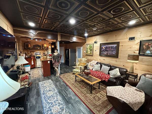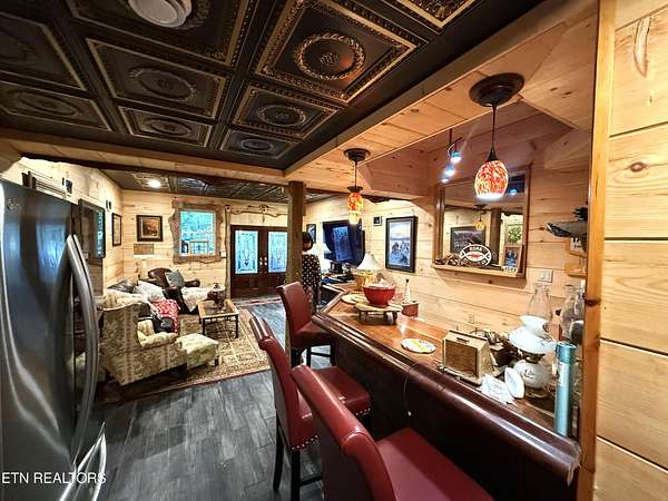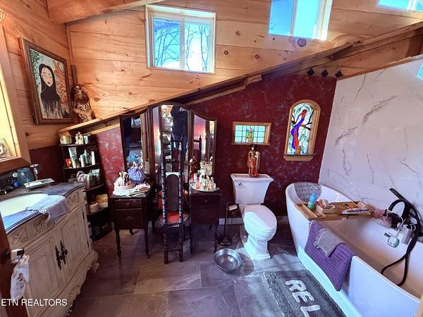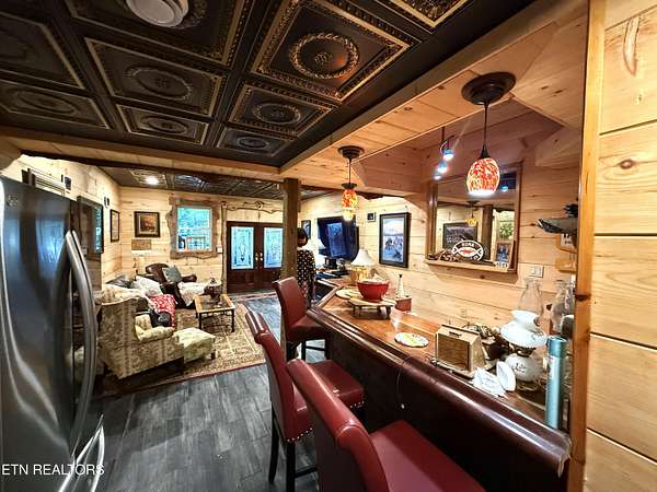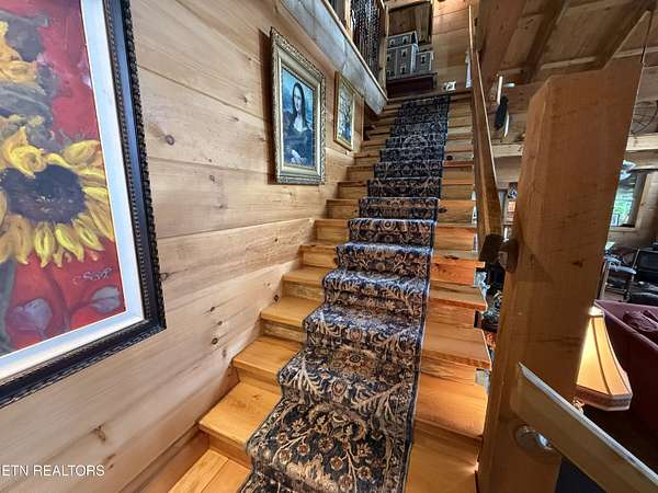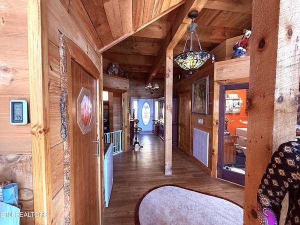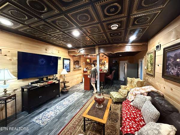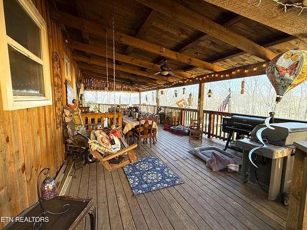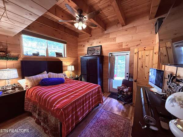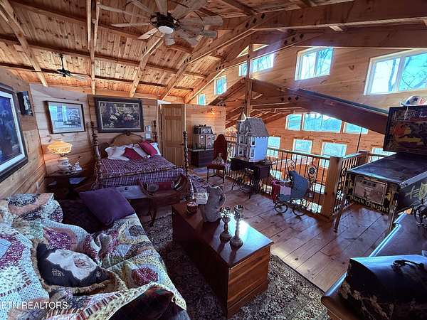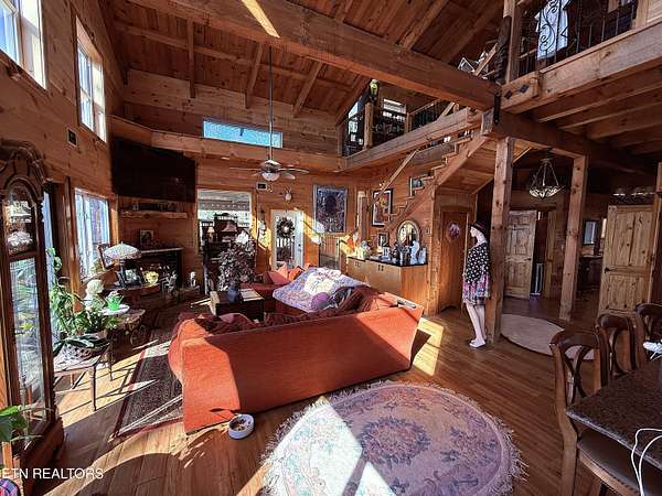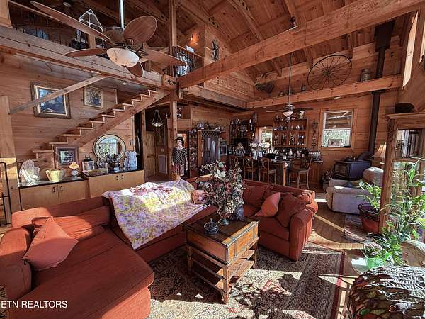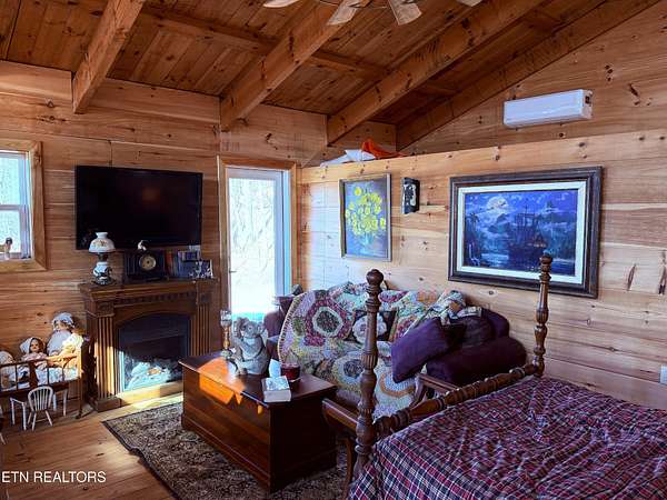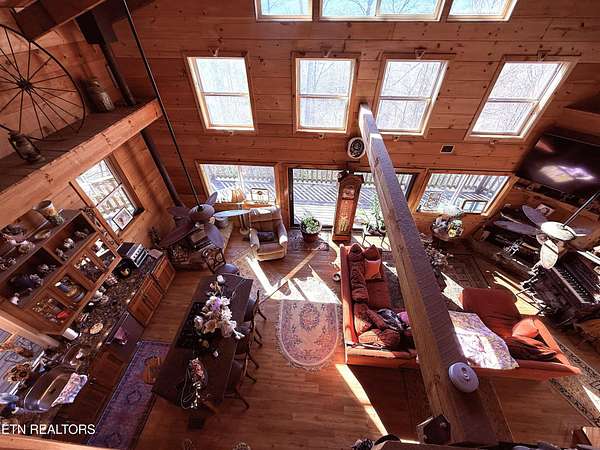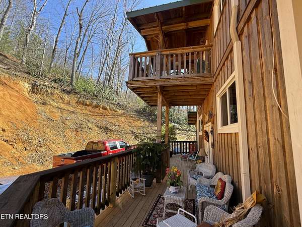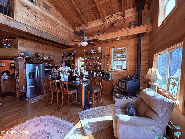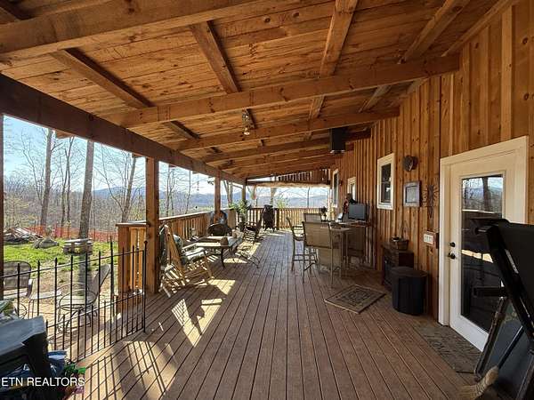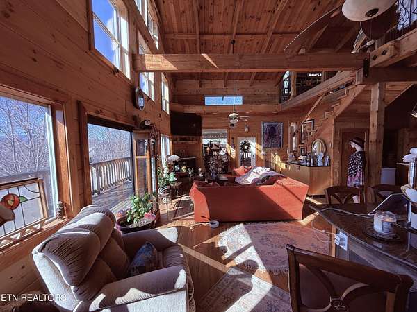 Nestled in the serene beauty of Cosby, Tennessee, this stunning cabin-style home offers a perfect blend of rustic charm and modern amenities. With 2 bedrooms, 2.5 bathrooms, and 2 extra rooms, this 2280 SqFt cabin sits on approximately 4.18 acres. The property features a spacious wrap-around porch, perfect for enjoying breathtaking mountain views. The primary bedroom is upstairs along with a large loft, and the home boasts thoughtful design touches like Black Walnut Trim and Live Edge around the doors. The kitchen is equipped with both gas and electric cooktops, a refrigerator, wall oven, dishwasher, microwave, and stone counters. The living room has a wall of windows to enjoy the views and a wood stove to keep you warm on chilly nights. The fully equipped 24x30 workshop in the basement is ideal for hobbyists, craftsmen, or extra storage, and there's a 14x30 entertainment room great for guests or as an extra room. The cabin-inspired interior features open living spaces, high beamed ceilings, and plenty of natural light, creating an inviting atmosphere year-round. Lights are currently being updated, and satellite internet is available. New decking boards on the un-covered porch. Ceiling completed in the finished part of the basement. Located in the peaceful Cosby area, a gateway to the Great Smoky Mountains National Park, Gatlinburg, and Pigeon Forge, this property offers a tranquil escape with easy access to hiking, fishing, and local attractions. With its distinctive features and prime location, this mountain-view cabin is a standout choice for a personal getaway or a highly sought-after Airbnb rental