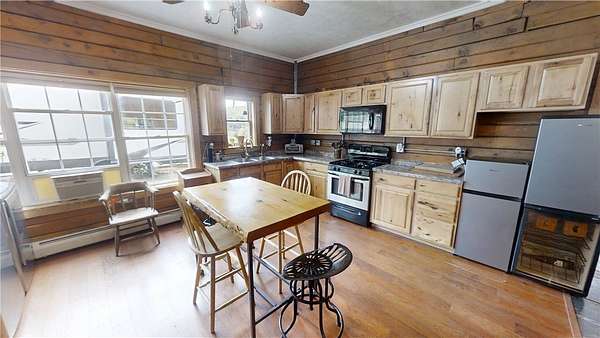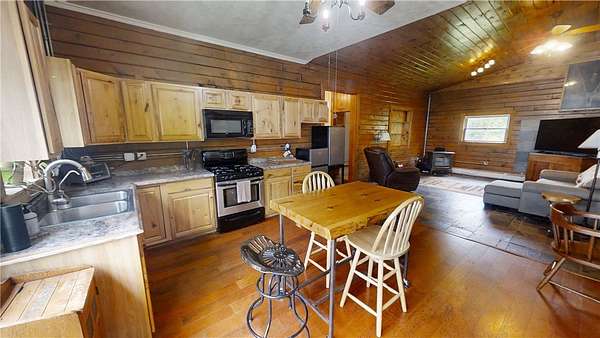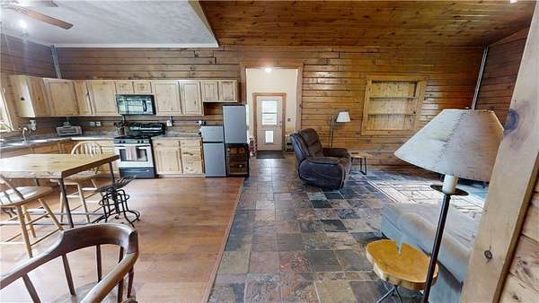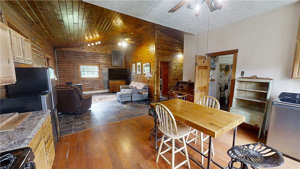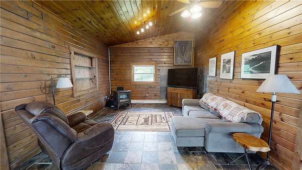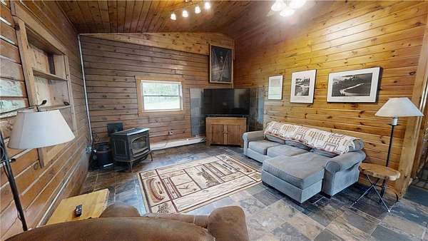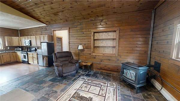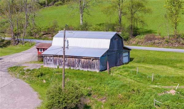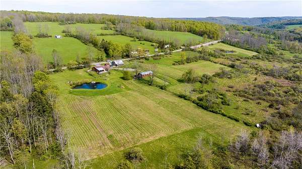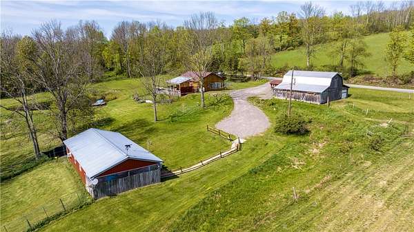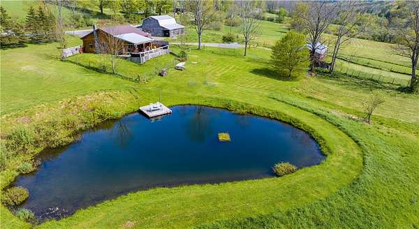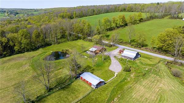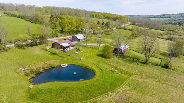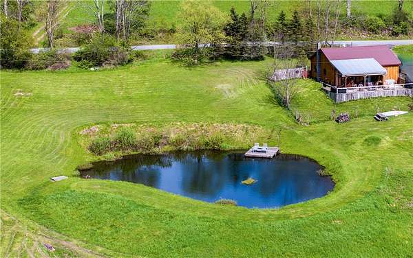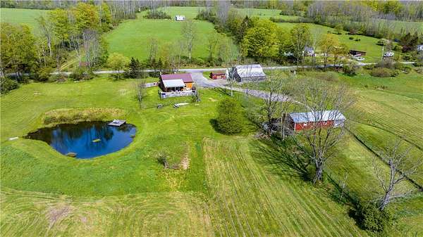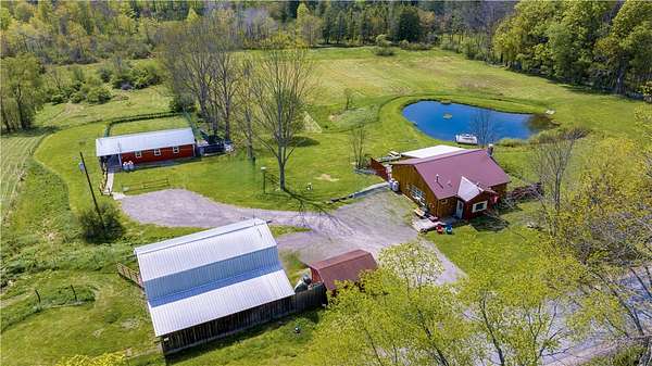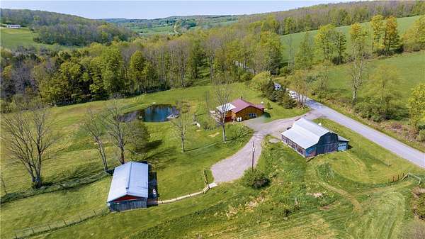 Just minutes from downtown Norwich, this charming cabin-style home sits on 26 scenic acres designed for adventure and relaxation. Gather with friends and family or take time for quiet reflection, you can have it all here. Hunt, fish in one of two stocked ponds- one of the ponds is swimmable and has its own dock, perfect for jumping in or chilling in a Adirondack chair taking in the view. Hop on your snowmobile or side by side and take a ride on trails located right outside your own back door. And if that's not enough, this property is located just steps away from the Chenango Greenway Stone Quarry Trail where you can enjoy hiking, mountain biking and panoramic views of Norwich and beyond from the top of the Quarry. Inside, this inviting 3 bedroom, 1 bath home features an open floor plan with a light filled eat in kitchen and living room with pellet stove bringing warmth and a source of efficient heat. Step outside to the tranquil deck with sweeping views of the hillside, swimming pond and roaming wildlife - perfect for enjoying your morning coffee, unwinding at the end of your day with dinner and your favorite beverage or just taking in your peaceful surroundings. Whether you are planning a weekend escape or forever home, this home offers the ideal blend of comfort, adventure and natural beauty. Additional features include (1) Versatile steel sided pole barn with radiant floor heating, water and its own septic. This building is currently used as a boarding business for dogs, but the possibilities are endless! Think - home business, art studio, or convert into additional living space for when friends and family are visiting, a rental property, Airbnb, (2) barn with 3 stalls - perfect for horses, livestock, hobby farming - electric, water, and plenty of room to store your recreational vehicles. (3) Approximately 17 fenced acres help make this property livestock ready. (4) RV hook up (5) Large shed with electric could make a great workshop With 1,500 feet of frontage on a quiet country road, this property offers privacy without isolation. Whether you're looking for a recreational getaway or year-round country living, this home checks every box.