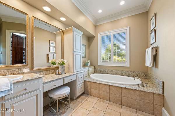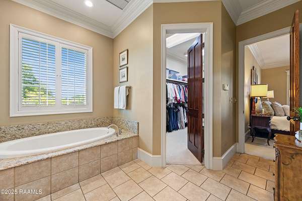 - 9+ ft Ceiling, Attic Access, Bookcases, Built-In Features, Built-Ins, Crown Molding, Double Vanity, Dual Closets, Granite Counters, High Ceilings, Kitchen Island, Office, Primary Bath, Separate Shower, Varied Ceiling Heights, Walk-In Closet(s), Walk-In Pantry