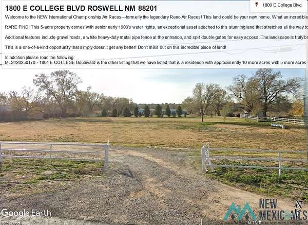 RARE FIND! This 5-acre property comes with senior early 1900's water rights, an exceptional asset attached to this stunning land that stretches all the way to the picturesque Spring River. The property boasts significant infrastructure to support any build, already including a new, high-end well installed just a few years ago (per the seller).This property has a very expensive underground water infrastructure that is invaluable for crops, in fact it has seven (7) total risers across the property. This property is has infrastructure for a new house build as well that is already in place on the site. Additional features include a large garage/barn, gravel roads, a white heavy-duty metal pipe fence at the entrance, and split double gates for easy access per sellers. The landscape is truly breathtaking, teeming with wildlife, birds, and a serene river flowing through it. This is a one-of-a-kind opportunity that simply doesnt get any better! Dont miss out on this incredible piece of land! In addition please read the following: MLS#20250170 - 1804 E COLLEGE Boulevard is the other listing that we have listed that is a residence with approximately 10 more acres with 5 more acres of WATER RIGHTS if your buyer would like an entire paradise and privacy! You have to see this listing to understand it or click on the Virtual drone footage.