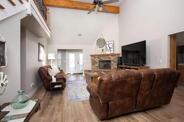 Discover your dream country estate on 9+ breathtaking acres! This beautifully crafted 5 bed, 5 bath home features soaring ceilings, an airy and functional layout, a striking staircase, and a warm, statement brick fireplace. The gourmet kitchen impresses with rich custom wood cabinetry, sleek stainless appliances, a gas range, and an oversized island perfect for entertaining. Enjoy abundant natural light, expansive views, and peaceful surroundings with room to roam. Property includes 4 spacious garage stalls, shop space, 4 horse stalls, a roping arena, and a charming detached 1 bed/1 bath apartment--ideal for guests, or rental income. A rare blend of refined and stylish comfort, functionality, and wide-open Texas living just minutes from town!