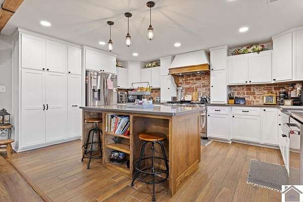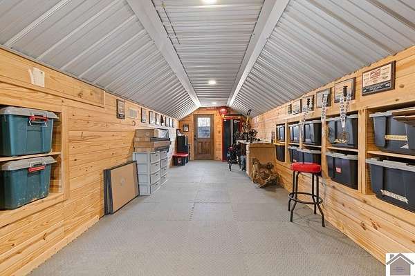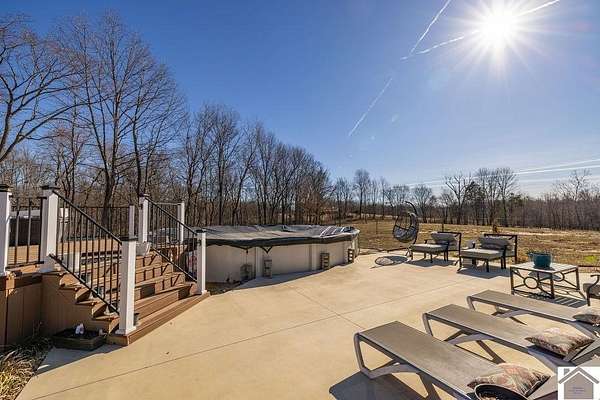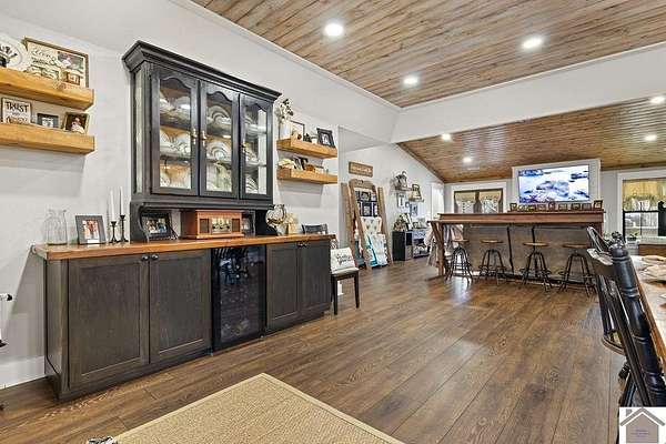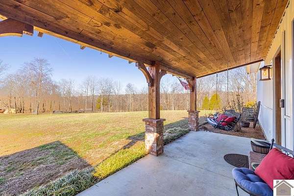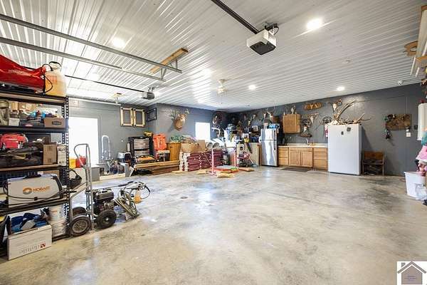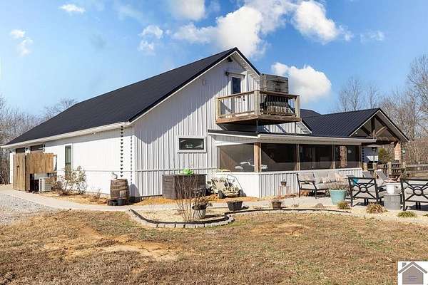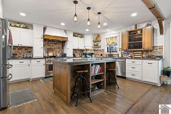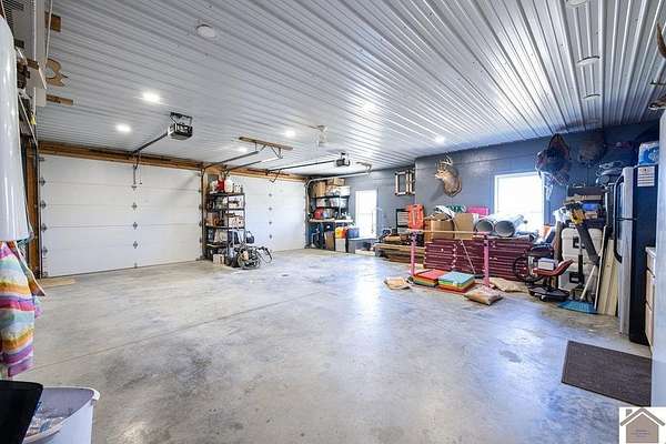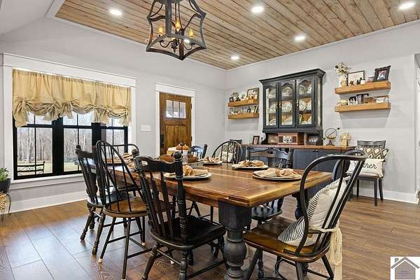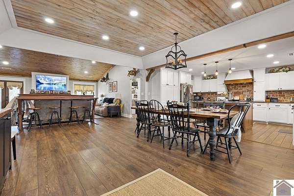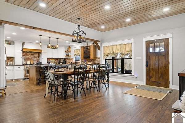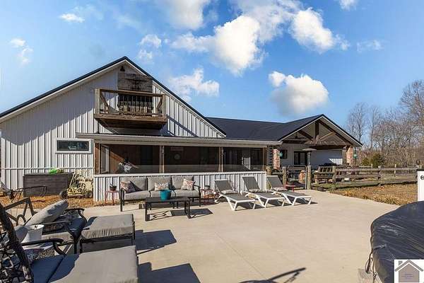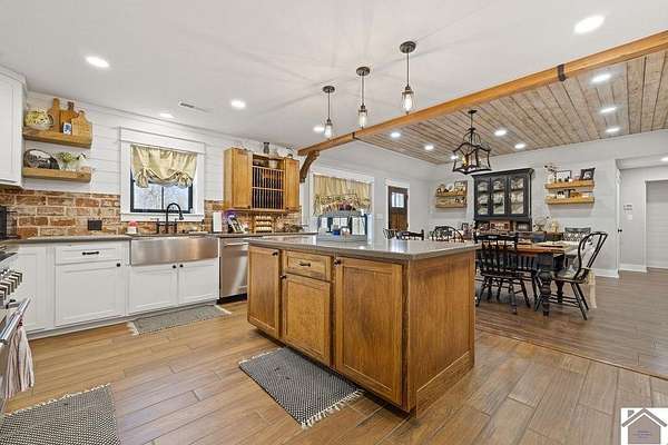Beautiful modern farmhouse-style home located at 1800 Wray Road in Wingo, KY featuring 5 bedrooms and 3 full bathrooms with a spacious open-concept design. The main living area offers vaulted wood ceilings, exposed beams, and abundant natural light, creating a warm and inviting atmosphere. The kitchen features white cabinetry, brick backsplash, stainless appliances, and a large center island, flowing seamlessly into the dining and living areas—perfect for entertaining. The upstairs bonus room provides the perfect man cave, game room, or additional living space. Situated on 5 acres, the property also includes a horse barn and plenty of room to enjoy country living. Outdoor amenities include a covered entertainment area with outdoor kitchen and an above-ground pool, ideal for gatherings. A large attached garage/shop provides excellent space for vehicles and equipment.
