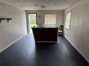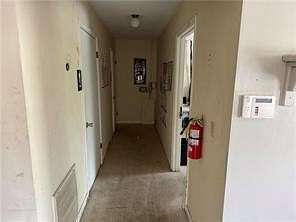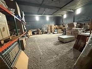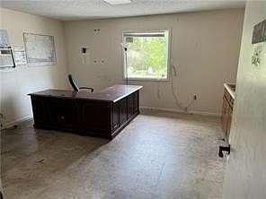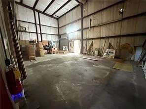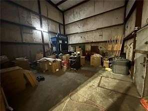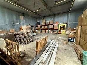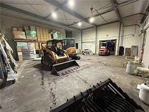 Key features of the property include a 22-foot wall height, concrete flooring, and two loading docks with roll-up doors. The front entrance opens into a spacious lobby that includes an office and two restrooms. Additionally, the property is equipped with a private well and septic system, as well as access to city water and sewer.
