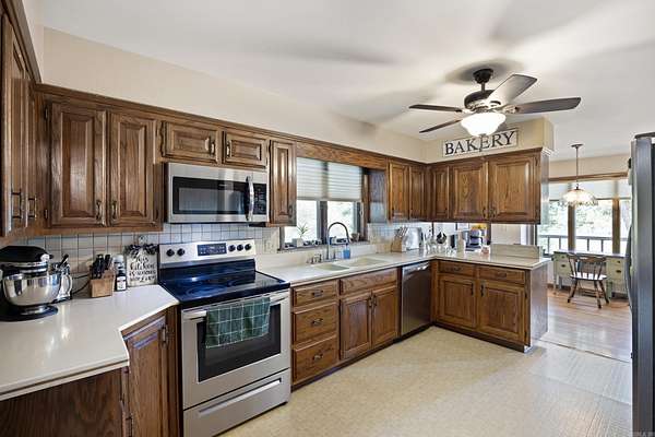 Escape to the peace and beauty of the countryside with this spacious 4-bedroom, 3-bath brick home situated on 40 picturesque acres along Highway 28 in Ola. Offering more than 2,400 sq. ft. of living space, the home features an inviting floor plan with hardwood and laminate flooring, four wood-burning fireplaces, and a bright kitchen with modern appliances. A separate in-law quarters with its own entry provides the perfect setup for extended family, guests, or even rental income. Multiple outdoor living spaces invite you to relax and take in the scenic surroundings. The land is equally impressive, offering 40 acres of opportunity for a hobby farm, hunting retreat, or simply a private escape. Two ponds, fencing, and plenty of open space make it ideal for livestock or recreation. Located next to Two Rivers Schools and just a short drive to Russellville, this property combines the best of privacy and convenience. Don't miss your chance to own this rare country retreat.