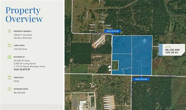 From Highway 59 in Decatur, head south on AR-59 for approximately 3 miles. Turn right onto Y City Road and continue west for about 1.5 miles. Property will be on the left. Look for gate and signage at entrance.