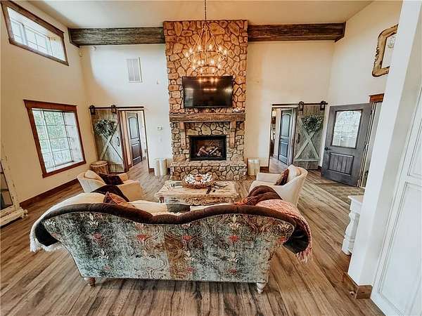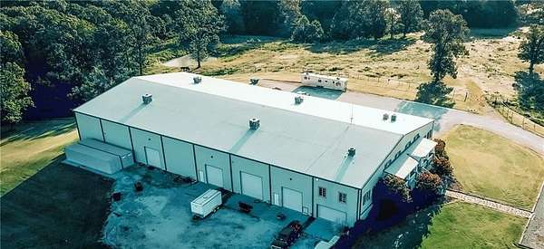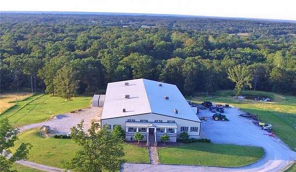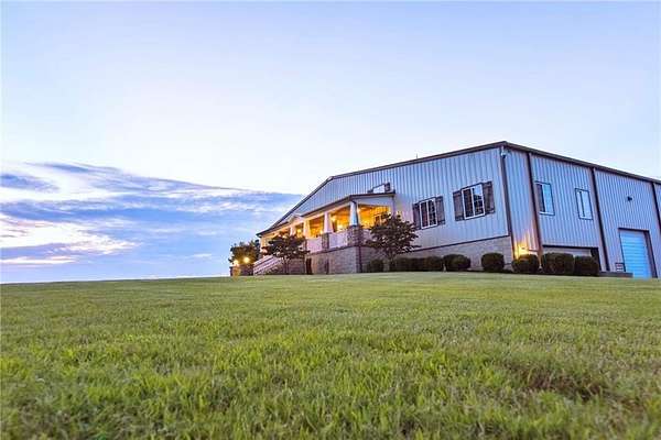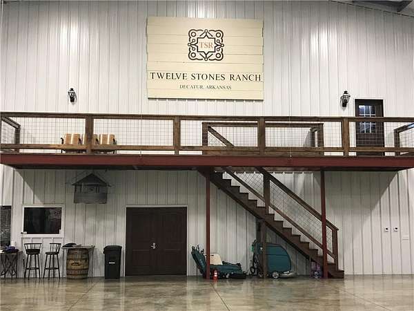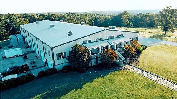 Discover Twelve Stones Ranch -- a 145-acre destination in Northwest Arkansas offering a rare combination of beauty, function, and potential. Behind a gated entrance, a half-mile drive winds past rolling pasture, custom pipe fencing, and double ponds, leading to the heart of the property. Here, a 2,500 square foot barndominion-style homestead provides four bedrooms, four bathrooms, a full kitchen, dining room, and living room with fireplace. A wide porch opens to sweeping views, creating the perfect place to gather and unwind. Connected to the home, a 20,000 square foot shop delivers unmatched capability. Ten roll-up bay doors, advanced climate control, office space, tornado shelter, backup power, and Starlink internet make this space ideal for ranching, hosting, storage, or business operations. Additional improvements include a three-bedroom ranch manager's home with full utilities and tornado shelter, as well as a livestock watering system and thoughtfully designed infrastructure throughout.