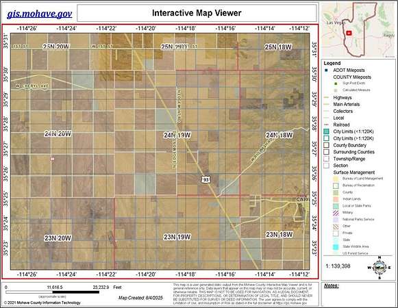 From US Hwy 93, turn west onto 21st Street (dirt road access). Continue approximately 0.6 miles. Parcel is located on the south side of the road. Use GPS coordinates 35.6121 degrees N, 114.3355 degrees W for navigation. Recommend using a high-clearance vehicle.