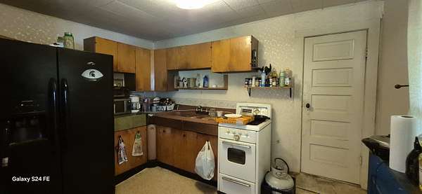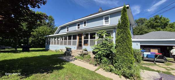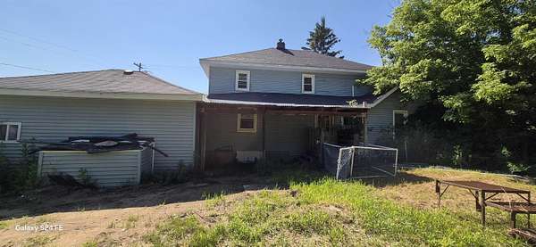 Spacious home between Midland and Sanford. Three bedrooms, a storage room and bathroom on the upper level. Hardwood floor in the living room. There is a dining room, kitchen and main level bathroom. The bathtub is in a separate room. There is also a master suite or in-law quarters with one bedroom one bathroom, kitchen and living room and the entrance to the partial unfinished basement. First step is steep. Be careful. Has its own driveway and entrance on the north end of the shared covererd porch. There are repairs and updating needed in the home. There is a large back yard. Two car detached garage. Shed is included. City Water. The Pere Marquette Rail Trail is the other side of Saginaw Rd. It is a 30 mile scenic paved trail that runs between Midland and Clare, Michigan. Great location. Property is 1.92 acres with frontage on Hope Rd and Saginaw Rd.