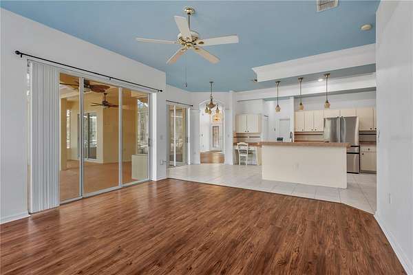 The residence offers three bedrooms and two bathrooms, including a recently renovated bathroom, luxury vinyl flooring throughout, and retractable shutters on main windows. Recent improvements include a roof replaced in November 2019 (less than six years old) and a recently replaced hot water heater. Pocket doors from the main living area open to the first lanai, featuring an easy-to-maintain decorative pond with waterfall providing tranquil indoor/outdoor living space.
