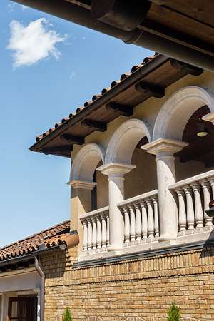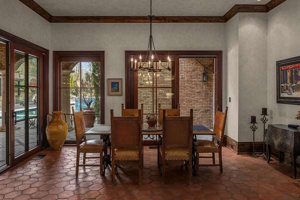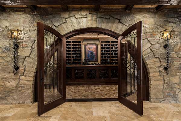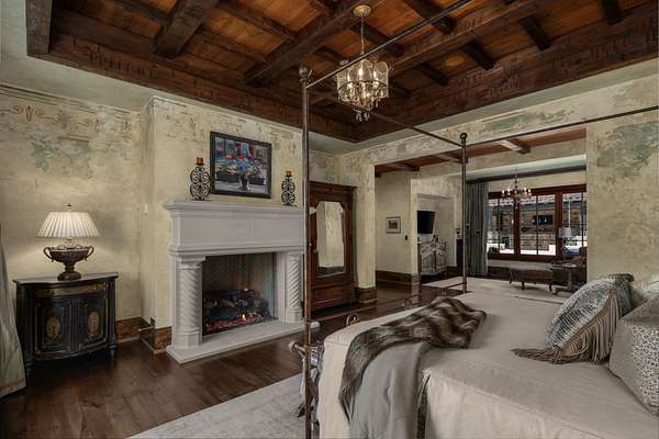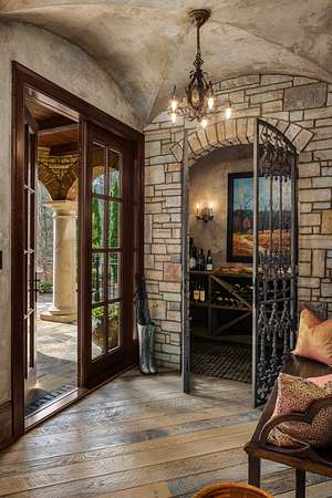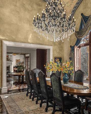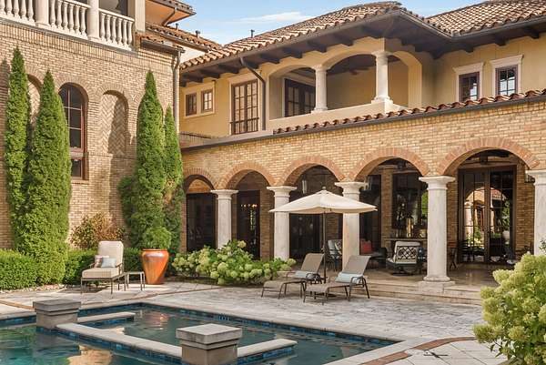 Outside, resort-style grounds transport you to the Italian countryside with a saltwater pool and spa, fully equipped outdoor kitchen with wood-fired pizza oven, and a fire pit framed by a replica “ruins wall” inspired by ancient Italy. Designed for privacy and security, the estate sits on 2.5 acres and includes an elevator, hidden safe room/storm shelter, large kitchen loggia, multiple balconies, a seven-car garage, and advanced Control4 smart home technology.