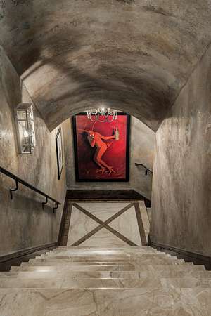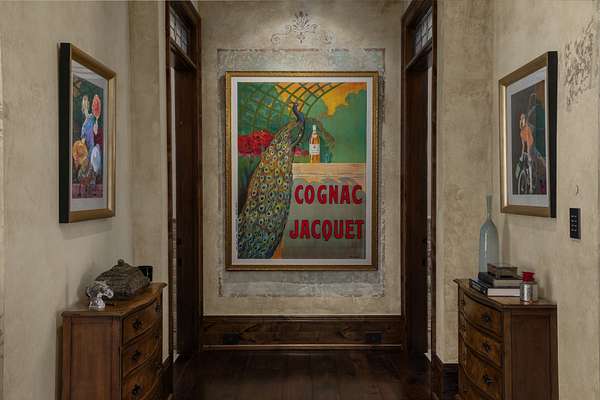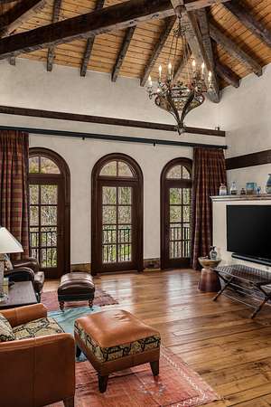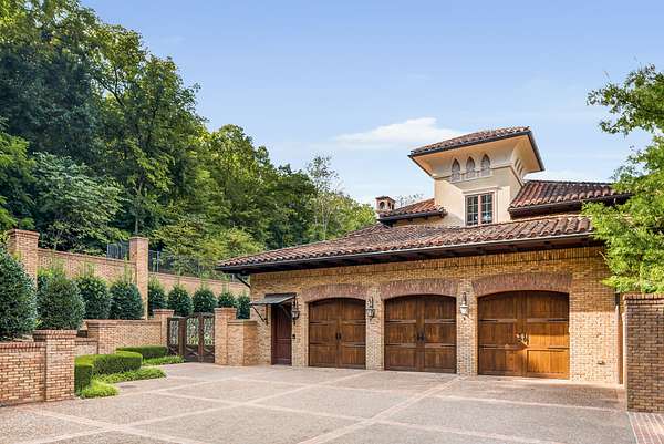 At the heart of the home, the kitchen wows with a bricked barrel ceiling, Sub-Zero refrigerator, 60” Wolf range, dual dishwashers, and even a Sonic-style ice maker, perfect for effortless entertaining. A private retreat awaits in the fourth-floor Eagle’s Nest, offering sweeping views of the wooded hillside, along with a continental kitchen, full bath, office, and a large screened outdoor patio. The amenities continue to the lower level with a movie theater featuring Klipsch audio and Dolby Atmos surround sound, a 750-bottle temperature-controlled wine cellar, a pub-inspired game room with a full bar, and a wellness suite complete with a gym and steam shower. Above it all, a hand-molded, kiln-fired barrel tile roof crowns the home with a distinctive piece of architectural history, proudly registered for its significance.