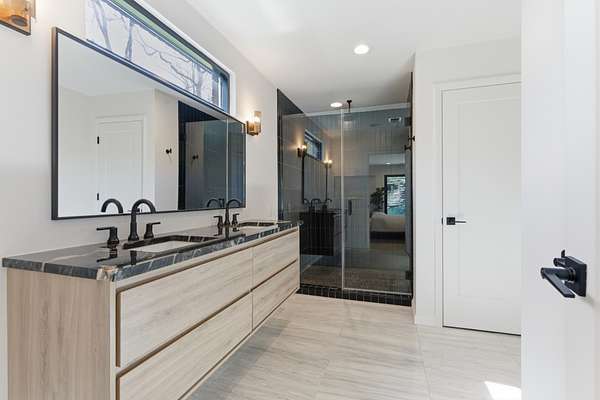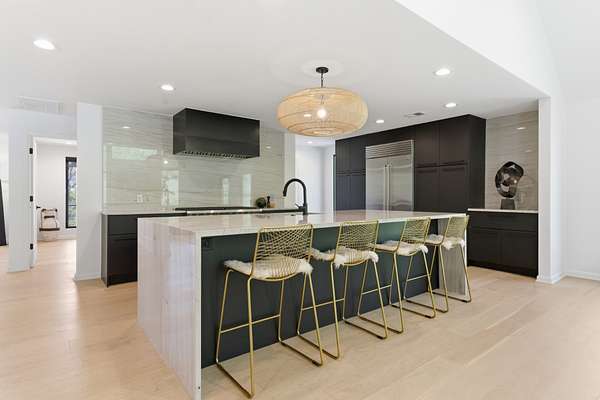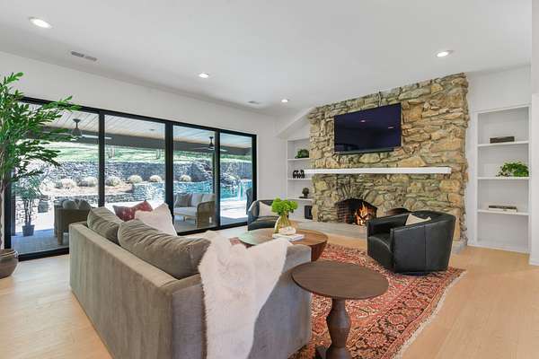 The home features an open-concept layout with expansive living, dining, kitchen, and den areas—ideal for both everyday living and entertaining. Thoughtfully designed with natural stone finishes and a sophisticated modern aesthetic, it includes two gas fireplaces, including a statement linear fireplace in the primary suite. Floor-to-ceiling windows flood the interiors with natural light and frame serene views of the surrounding landscape.