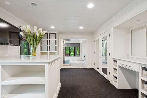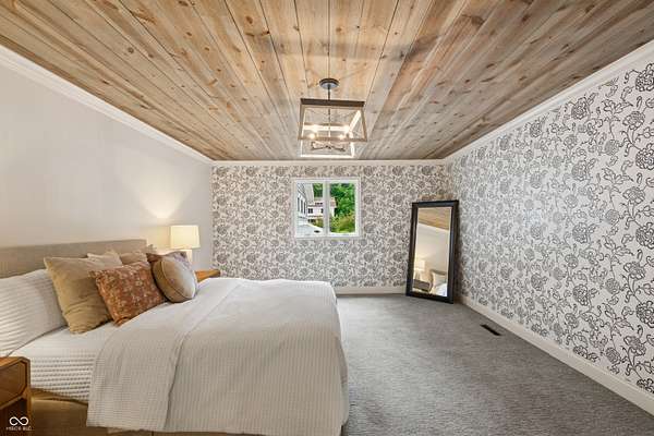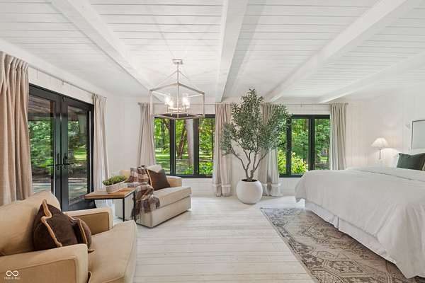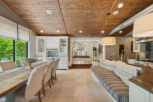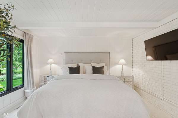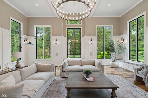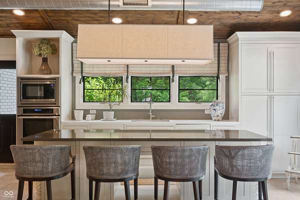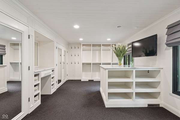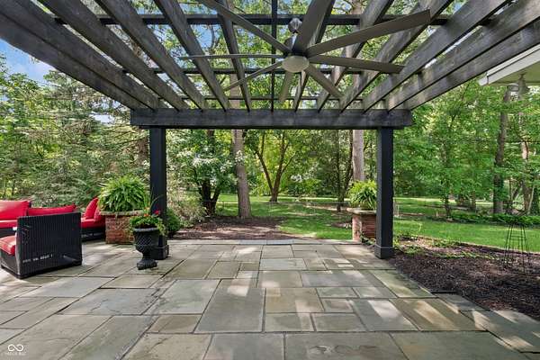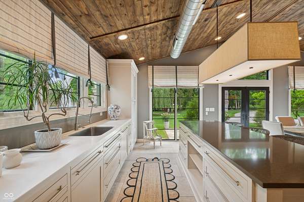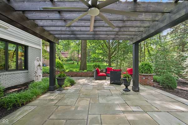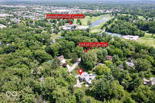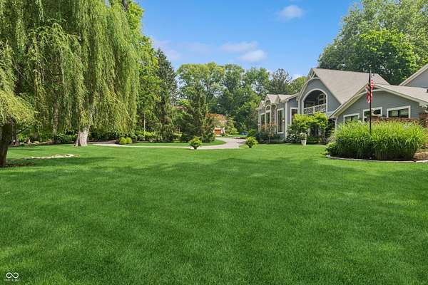 Tucked away on a quiet cul-de-sac just minutes from downtown Carmel, this hidden gem sits on over 2 acres of beautifully landscaped grounds and offers the perfect combination of privacy, luxury, and location. The property is a true retreat, with a stunning outdoor living area that includes a gas firepit, pergola, bluestone patio, raised garden beds, and a gently flowing stream with a newly updated bridge. Lush, mature landscaping surrounds the home, creating a peaceful and private escape in the heart of it all. Inside, a massive great room with soaring ceilings and oversized black windows creates an impressive and inviting gathering space. The updated kitchen features Italian tile flooring, two large islands, a beverage and wet bar station, and an extra-large walk-in pantry with built-in fridge-perfect for entertaining. A wine cellar is tucked just off the main living space for added sophistication. The main-level primary suite is over 1,000 square feet and lives like a private wing, complete with a cozy sitting room and wood-burning fireplace, spa-inspired bath with steam shower and floating Jacuzzi tub, custom Restoration Hardware vanity, and an extraordinary walk-in closet with built-ins, vanity, center island, and a dedicated laundry room. A second primary suite upstairs includes two closets, double vanities, and its own rooftop deck overlooking the grounds. An additional oversized laundry room is also located on the upper level for added convenience.The versatile loft space, complete with a private balcony and full bath, serves perfectly as a guest suite, office, workout room, or kids' hangout. The walk-out basement features a full kitchen, home theater with projector and oversized screen, and new carpeting throughout. With direct access to the Monon Trail, Woodland Country Club just steps away, and Carmel's best dining and shopping moments from your door, this one-of-a-kind estate offers luxurious living on over 2 acres in a truly prime location.