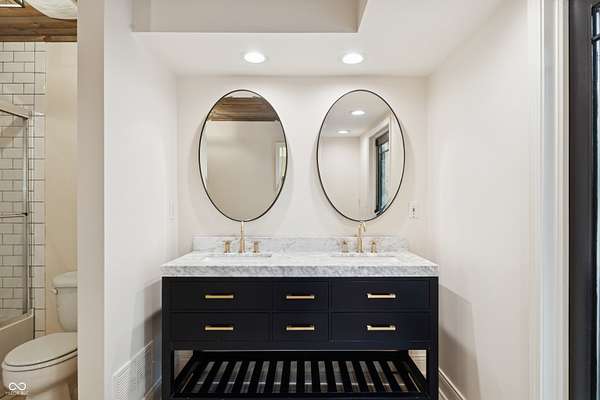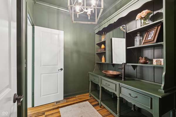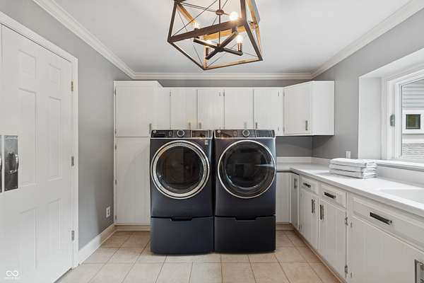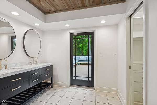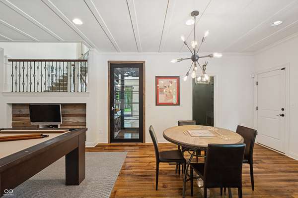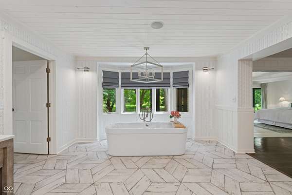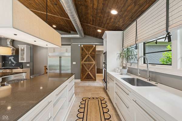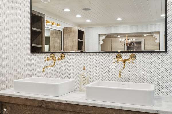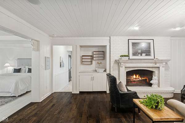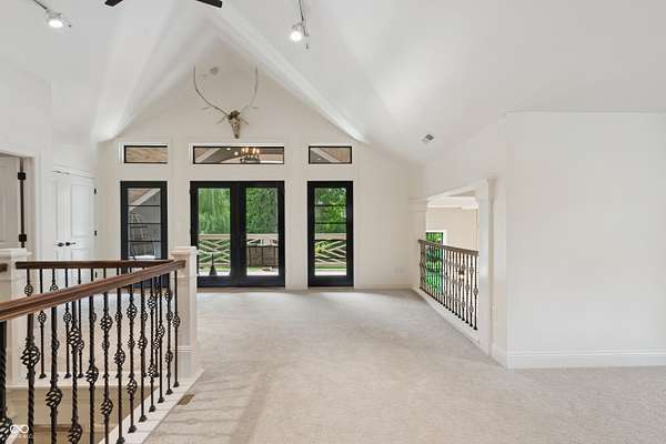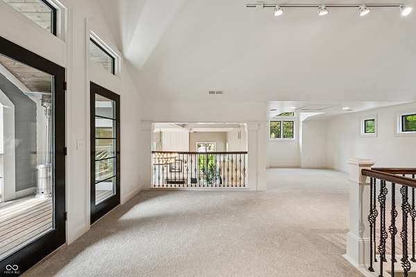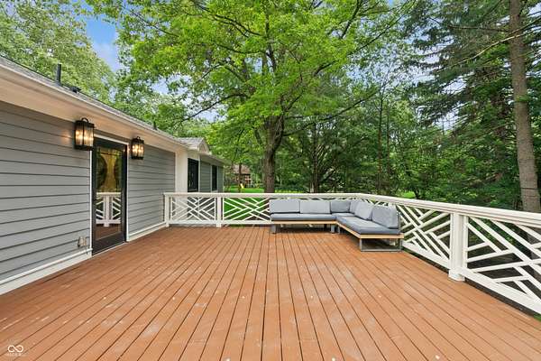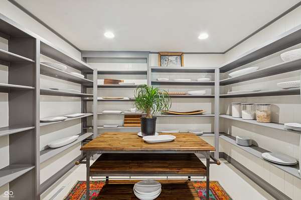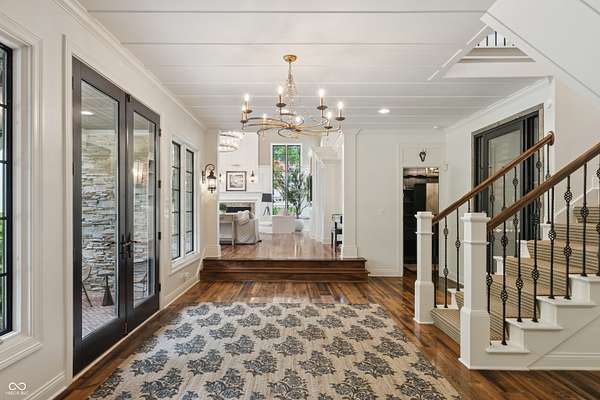 Tucked away on a quiet cul-de-sac just minutes from downtown Carmel, this hidden gem sits on over 2 acres of beautifully landscaped grounds and offers the perfect combination of privacy, luxury, and location. The property is a true retreat, with a stunning outdoor living area that includes a gas firepit, pergola, bluestone patio, raised garden beds, and a gently flowing stream with a newly updated bridge. Lush, mature landscaping surrounds the home, creating a peaceful and private escape in the heart of it all. Inside, a massive great room with soaring ceilings and oversized black windows creates an impressive and inviting gathering space. The updated kitchen features Italian tile flooring, two large islands, a beverage and wet bar station, and an extra-large walk-in pantry with built-in fridge-perfect for entertaining. A wine cellar is tucked just off the main living space for added sophistication. The main-level primary suite is over 1,000 square feet and lives like a private wing, complete with a cozy sitting room and wood-burning fireplace, spa-inspired bath with steam shower and floating Jacuzzi tub, custom Restoration Hardware vanity, and an extraordinary walk-in closet with built-ins, vanity, center island, and a dedicated laundry room. A second primary suite upstairs includes two closets, double vanities, and its own rooftop deck overlooking the grounds. An additional oversized laundry room is also located on the upper level for added convenience.The versatile loft space, complete with a private balcony and full bath, serves perfectly as a guest suite, office, workout room, or kids' hangout. The walk-out basement features a full kitchen, home theater with projector and oversized screen, and new carpeting throughout. With direct access to the Monon Trail, Woodland Country Club just steps away, and Carmel's best dining and shopping moments from your door, this one-of-a-kind estate offers luxurious living on over 2 acres in a truly prime location.