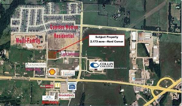 This premium corner 2.173 acre tract is one of the last available lots in Murphy's Crossing Commercial-Industrial Park. Located on Harvard Blvd, behind the bustling 'Farmers Food and Fuel Market' on the North side of busy Highway 380. Your other neighbors include Lexington Medical Lodge across the street, a strip center featuring Hunt Regional Urgent Care among others, and the Farmersville campus of Collin College just a couple of blocks away. Neighbors on the South side of Hwy 380 include Brookshires, O'Riley Auto Parts and a newly opened McDonalds. Harvard Blvd has an attractive, well maintained entrance off of Highway 380, and a business located here would also enjoy drive-by traffic from the neighboring Camden Park subdivision and new Fountainview apartment homes. This lot is adjacent to Camden Park Phase 2, currently under construction. Concrete road, curbs, sidewalk on West side and city services available, fire hydrant across the street. Highway 380 is one of the busiest thoroughfares in North Texas and will only get busier in coming years. Act Now to secure this excellent location for your commercial venture.
