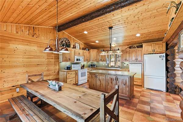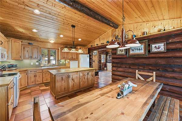 The interior blends rustic character with functional space, highlighted by vaulted T&G ceilings, a wood fireplace, and a large covered deck for enjoying the mountain views. An open layout on the main floor connects the kitchen, dining, and living areas. A custom wood dining room table and large kitchen island create ample space for family and friends to gather.