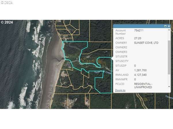 RARE, LARGE, 27.2 +/- OCEANFRONT PARCEL ZONED Rural Residential-5 (5 acre Min. Lot Size) with AGATE BEACH FRONTAGE & DIRECT AGATE BEACH ACCESS! Embrace the Beauty of Coastal Living with this expansive 27.2 +/- acre PARCEL, offering stunning OCEAN VIEWS and direct access to AGATE BEACH. Nestled in a RURAL PRIVATE GATED NEIGHBORHOOD, this high-quality PARCEL is Zoned RR-5 and could be split into MORE parcels, all with direct access to the Pacific Ocean! This LARGE Parcel provides Space with INCREDIBLE POTENTIAL to create your own TRAILS leading to EASY BEACH ACCESS! Imagine the possibilities, where you can enjoy the Sounds of the Ocean, WHITE WATER VIEWS and the Tranquility of Nature. LOCATED JUST 4 Miles NORTH of the Prestigious, WORLD RENOWN BANDON DUNES GOLF RESORT, this property combines Seclusion with proximity to WORLD CLASS GOLF and the vibrant coastal community. Whether you're looking to build a primary Oceanfront residence or CREATE MULTIPLE HOME SITES, this stunning property offers the Ultimate Landscape. Don't miss your chance to secure this RARE Opportunity! Start planning your Coastal Sanctuary Today! Buyers and Buyers agent to perform their own due diligence, please contact Coos County.